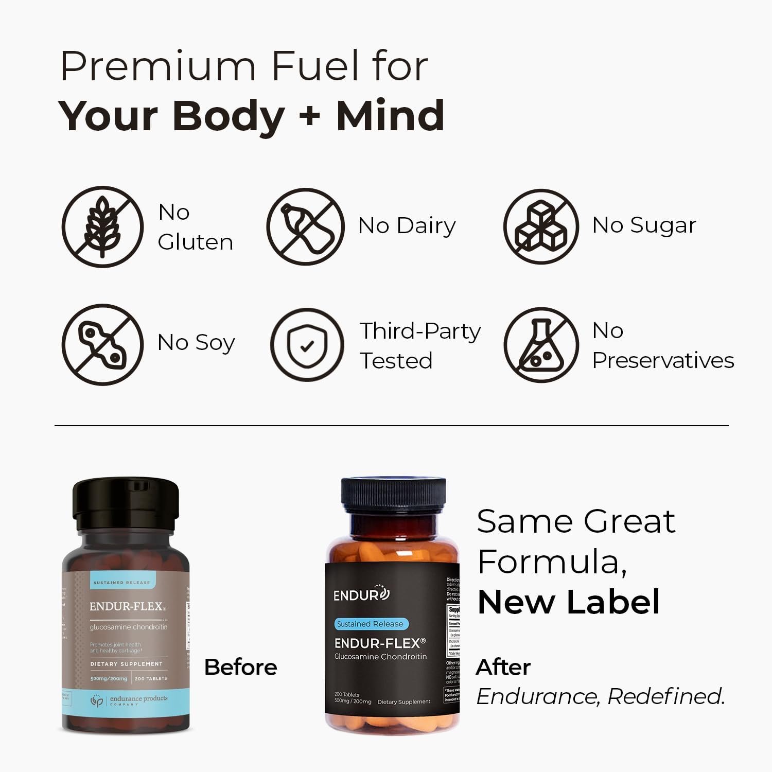 About this item GLUCOSAMINE & CHONDROITIN SUSTAINED RELEASE (SR): Has 500mg glucosamine and 200mg of chondroitin to support healthy joint function.* SUPPORTS JOINT HEALTH: Specially formulated to help maintain, rebuild, and repair cartilage tissue and lubricate joints.* 5-7 HOUR SUSTAINED RELEASE: Endurance Products Company’s sustained-release tablet technology slowly releases nutrients over 5-7 hours, mimicking how your body processes food for optimal absorption and maximum effectiveness. This minimizes side effects and digestive upset.* FREE OF COMMON ALLERGENS: Vegan/Vegetarian safe. No milk, egg, fish, shellfish, tree nuts, peanuts, wheat, corn, yeast, or soy. Gluten-free. No salt, sugar, starch, artificial flavorings, or preservatives. MEETS STRICT GOOD MANUFACTURING PRACTICES: Manufactured and packaged in the Pacific Northwest, USA at an FDA registered facility. Family-owned and operated since 1978. See more product details,GLUCOSAMINE & CHONDROITIN SUSTAINED RELEASE (SR): Has 500mg glucosamine and 200mg of chondroitin to support healthy joint function,SUPPORTS JOINT HEALTH: Specially formulated to help maintain, rebuild, and repair cartilage tissue and lubricate joints,5-7 HOUR SUSTAINED RELEASE: Endurance Products Company’s sustained-release tablet technology slowly releases nutrients over 5-7 hours, mimicking how your body processes food for optimal absorption and maximum effectiveness. This minimizes side effects and digestive upset,FREE OF COMMON ALLERGENS: Vegan/Vegetarian safe. No milk, egg, fish, shellfish, tree nuts, peanuts, wheat, corn, yeast, or soy. Gluten-free. No salt, sugar, starch, artificial flavorings, or preservatives,MEETS STRICT GOOD MANUFACTURING PRACTICES: Manufactured and packaged in the Pacific Northwest, USA at an FDA registered facility. Family-owned and operated since 1978