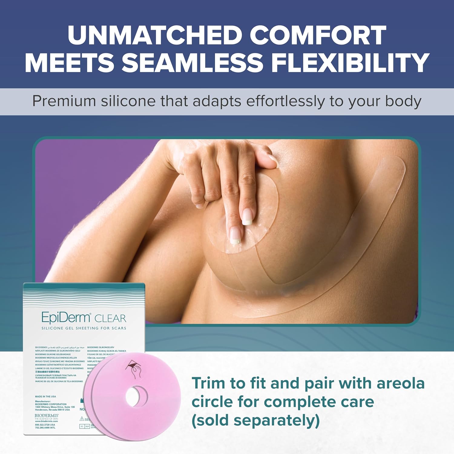 CUSTOMIZABLE FOR PERFECT FIT - Each silicone sheet can be easily trimmed for a personalized fit or paired with areola circles (sold separately). Enjoy a tailored experience for complete scar coverage with EpiDerm Mastopexy silicone tape for scars