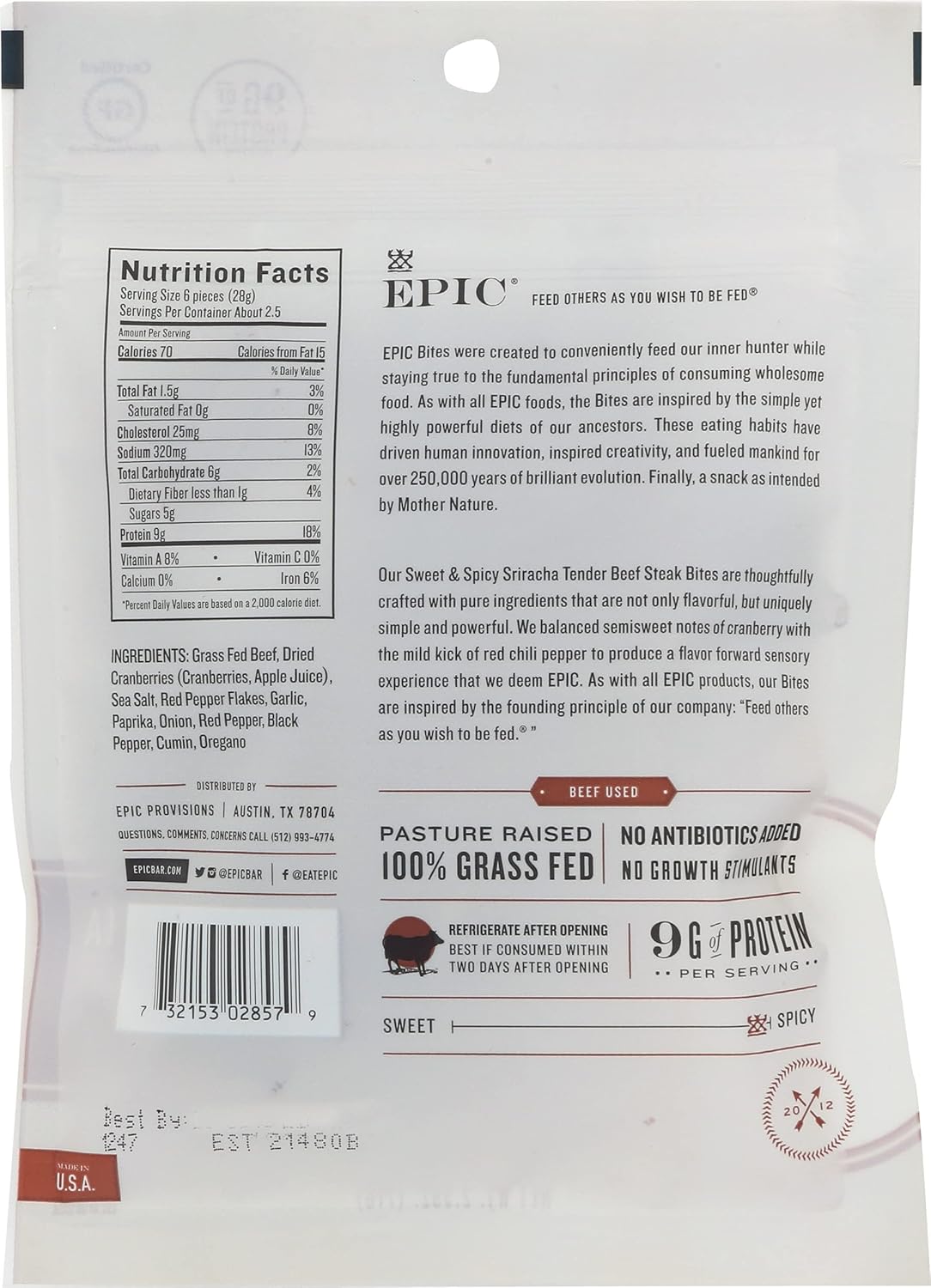 CONTAINS: One 2.5 oz pouch of EPIC Sweet and Spicy Sriracha Beef Bites