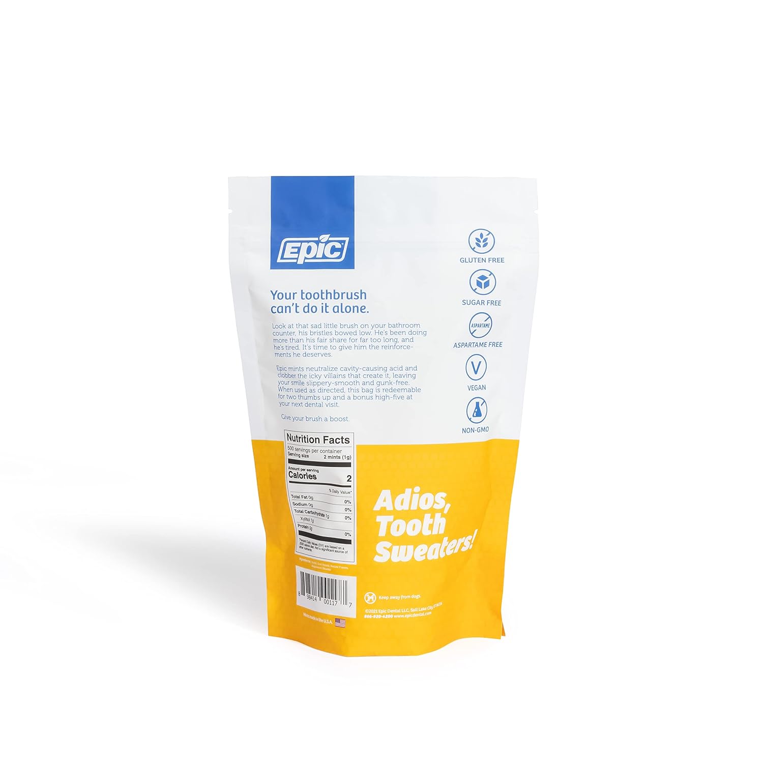 Sugarless Mints Without the Sugar Free Taste: Epic Mints are made with 100% xylitol to add a naturally sweet flavor you'll love; Sugar free and Aspartame free to keep blood sugar levels from jumpingHelps Stop Tooth Decay & Encourages Healthy Gums: These all natural Mints are Gluten-Free, Non-GMO & Vegan making them the perfect alternative to sugary products and a safe, preventative choice for kidsBanish Bad Breath & Dry Mouth: With 45% more Xylitol than other leading brands, Epic Mints deliver incredible flavor for fresh, amazing breath every time; Plus, they help reduce dry mouthTravel-Friendly, Easy to Dispense Packaging: Our 1000-Piece Bag maximizes your fresh breath and leaves plenty to share with 1000 total pieces; Packed in 1 Bag so you can take them with you on-the-go
