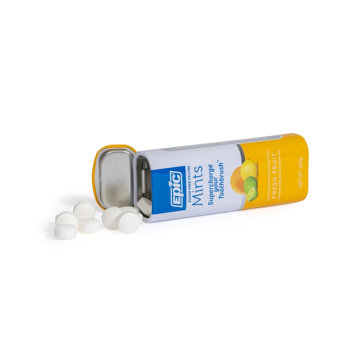 Sugarless Mints Without the Sugar Free Taste: Epic Mints are made with 100% xylitol to add a naturally sweet flavor you'll love; Sugar free and Aspartame free to keep blood sugar levels from jumpingHelps Stop Tooth Decay & Encourages Healthy Gums: These all natural Mints are Gluten-Free, Non-GMO & Vegan making them the perfect alternative to sugary products and a safe, preventative choice for kidsBanish Bad Breath & Dry Mouth: With 45% more Xylitol than other leading brands, Epic Mints deliver incredible flavor for fresh, amazing breath every time; Plus, they help reduce dry mouthTravel-Friendly, Easy to Dispense Packaging: Our 55-Piece Tin maximizes your fresh breath and leaves plenty to share with 55 total pieces; Packed in 5 Tin so you can take them with you on-the-go
