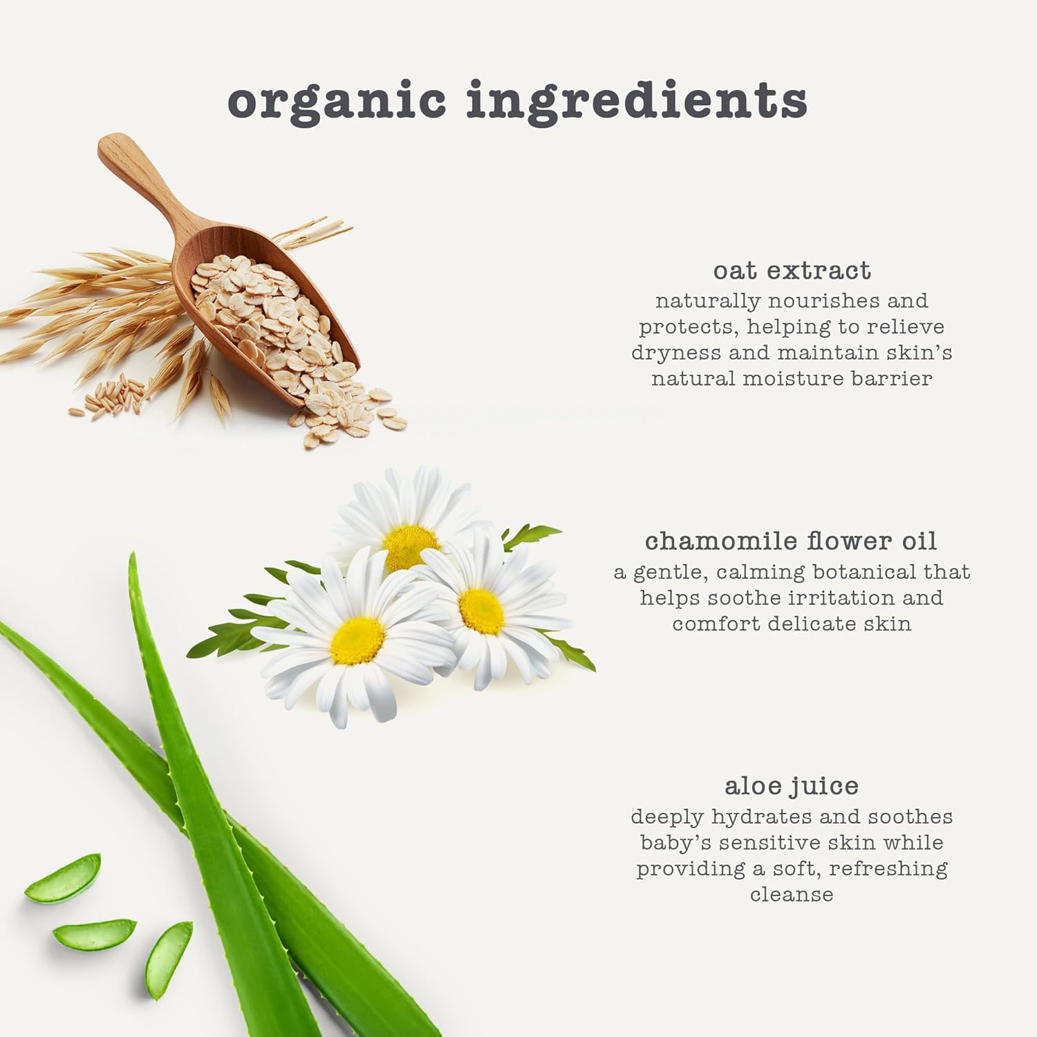 About this item Organically crafted - our organic baby wash is made with 77% organic ingredients and other natural herbs and botanicals Gentle for baby’s skin - super gentle baby wash is made with a coconut-derived cleansing agent that won’t strip or dry out baby’s skin Replenishes hydration - aloe juice and oat extract rehydrate baby’s thirsty skin and soothe dryness Soothes with grape root - Oregon grape root in this natural baby wash calms skin irritations and soothes skin conditions like eczema and dermatitis Calms baby’s senses - perfect for baby bath time before bed, this baby body wash calms and helps lull baby to sleep with chamomile oil See more product details,Organically crafted - our organic baby wash is made with 77% organic ingredients and other natural herbs and botanicals,Gentle for baby’s skin - super gentle baby wash is made with a coconut-derived cleansing agent that won’t strip or dry out baby’s skin,Replenishes hydration - aloe juice and oat extract rehydrate baby’s thirsty skin and soothe dryness,Soothes with grape root - Oregon grape root in this natural baby wash calms skin irritations and soothes skin conditions like eczema and dermatitis,Calms baby’s senses - perfect for baby bath time before bed, this baby body wash calms and helps lull baby to sleep with chamomile oil
