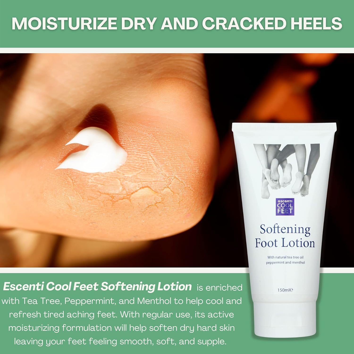 WITH Tea Tree Oil AND ACTIVE MOISTURIZERS - Escenti Cool Feet Softening Foot Lotion is enriched with Tea Tree, Peppermint and Menthol to help cool and refresh tired aching feet.With regular use its active moisturising formulation will help soften dry hard skin leaving your feet feeling smooth, soft and supple