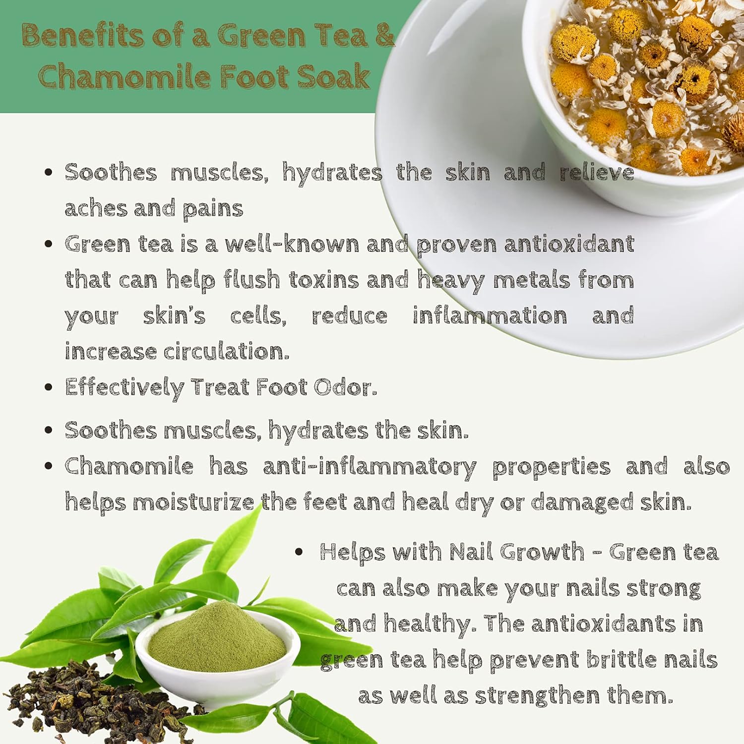 About The Product : ALL NATURAL AND THE PUREST MINERALS - Escenti Cool Feet Green Tea & Chamomile Soothing Foot Soak contains Pure Minerals and Natural Magnesium Sulphate Crystals as Foot Soak Salts that absorbs through the skin's surface to help support the removal of toxins. It can be used as a Foot Soak for Foot Spa sessions. It has Green Tea which is an antioxidant and can be used as a Smelly Feet Treatment