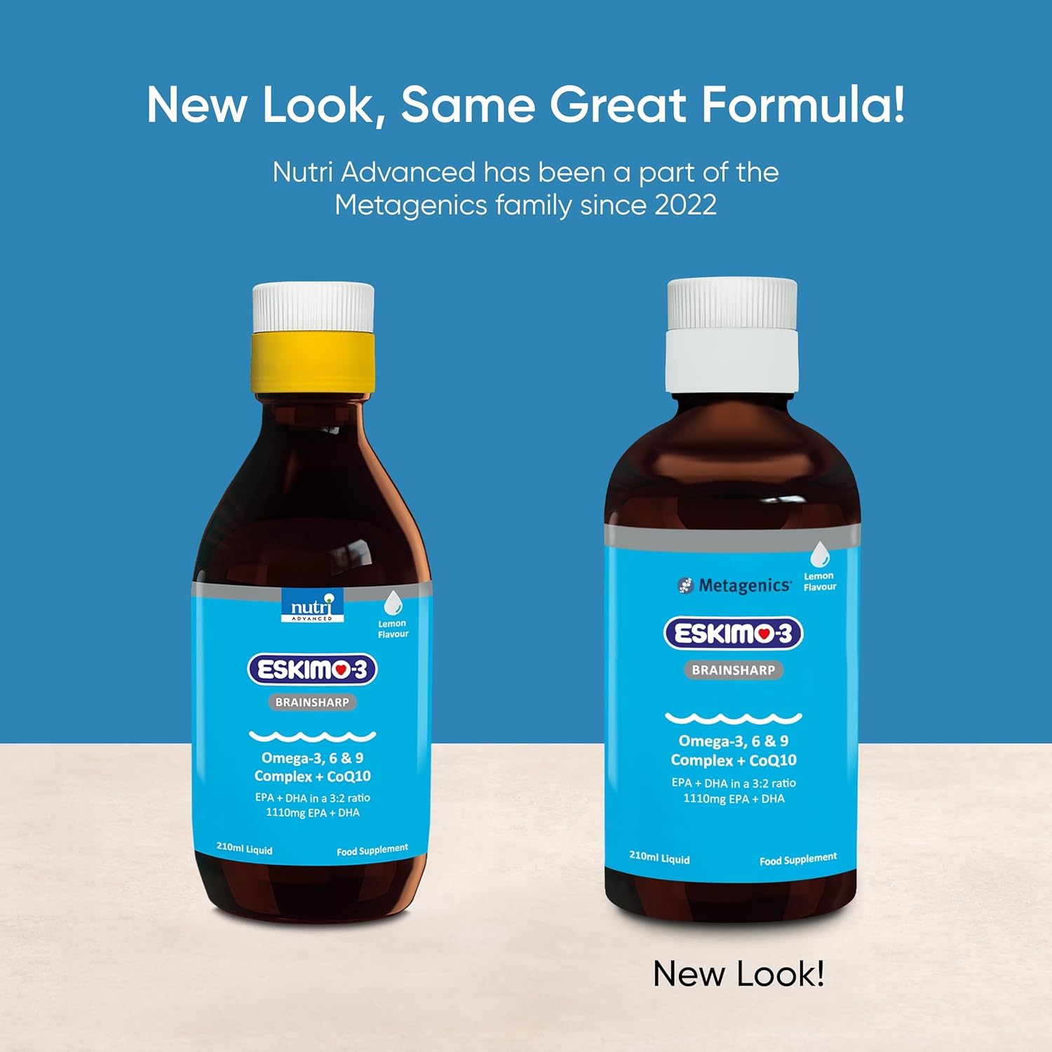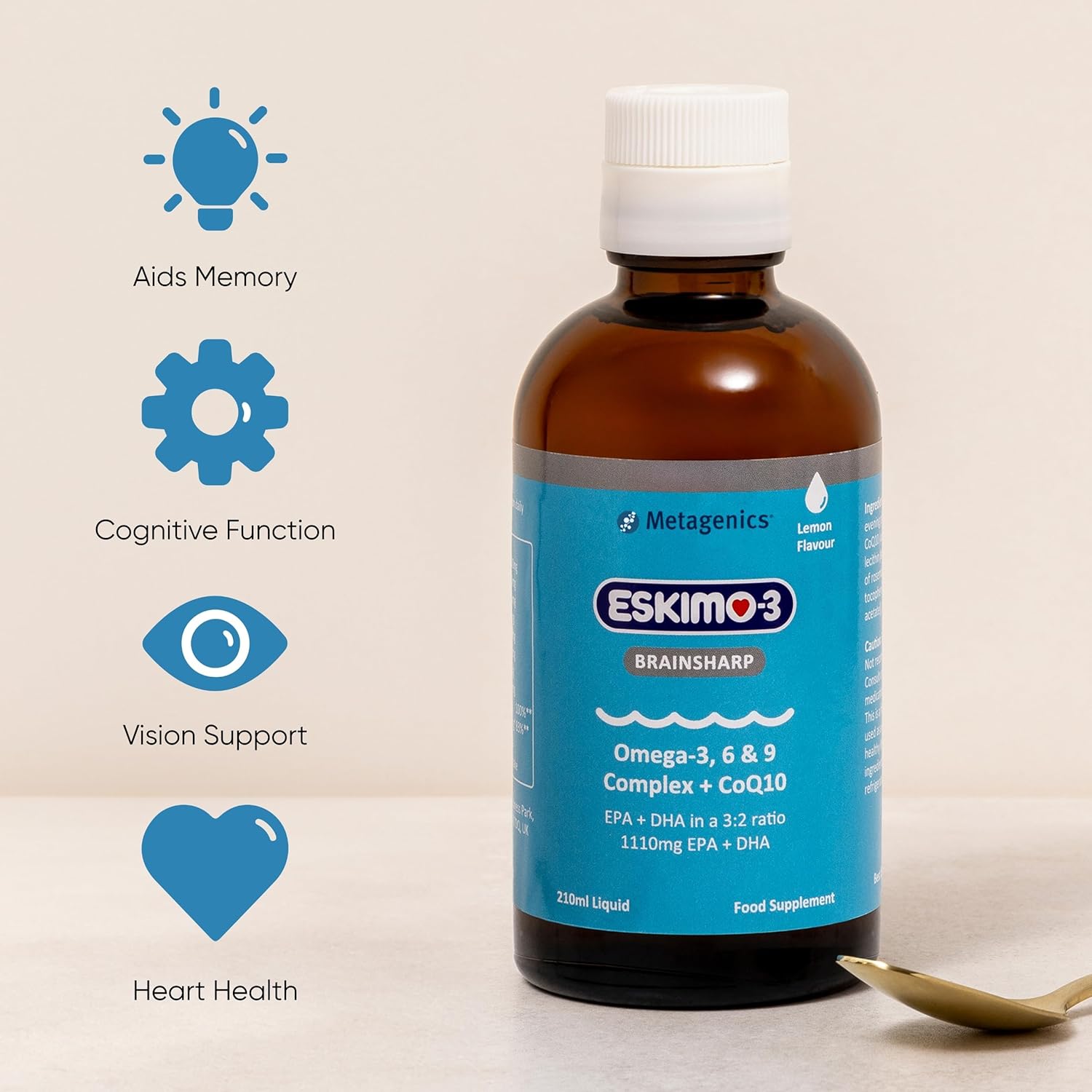 Eskimo-3 Brainsharp Fish Oil By Metagenics - Omega-3, 6 & 9 + Coq10 For Memory & Concentration - 1110Mg Epa & Dha - Lemon Flavour, 210Ml