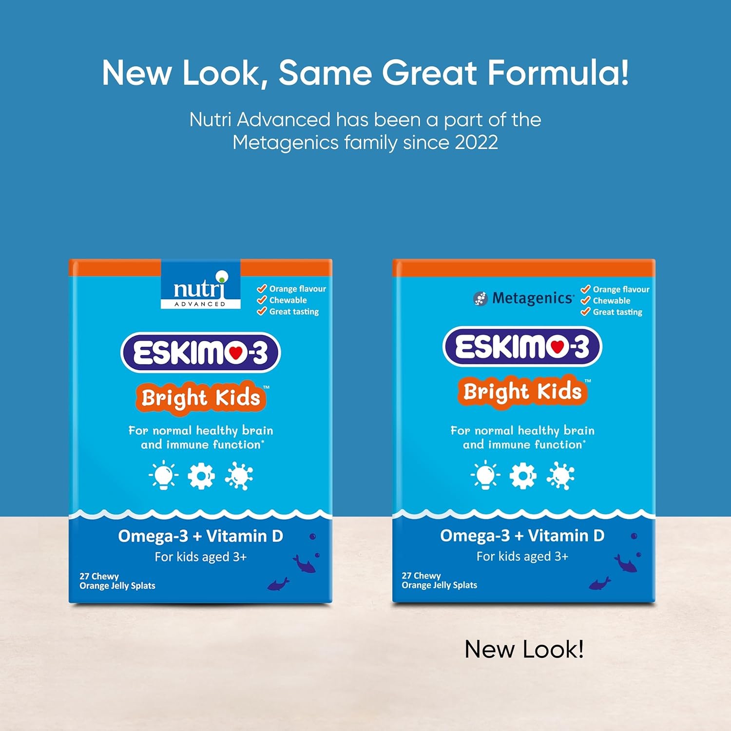 Product Description Formulated to provide a tasty & easy-to-take way of supporting kids' brain health with omega-3 essential fatty acids. Our jelly splats have been designed for children who may struggle to get enough fish in their diet and don't like taking traditional fish oil liquid or capsules. Taking 1 jelly splat daily provides DHA roughly equivalent to 4 or 5 small portions of oily fish per week. Each jelly tablet typically contains: Omega-3 fatty acids 362 mg Eicosapentaenoic acid 54 mg Docosahexaenoic acid 270 mg Vitamin D (cholecalciferol) (400iu) 10 µg Choline 21 mg Biotin 25 µg Other ingredients: Fish oil Xylitol Sorbitol Water Gelatin (bovine) Natural strawberry flavour Natural orange flavour Natural lemon flavour Trisodium citrate Alpha tocopherol Paprika Vegetable oil (trace) Ingredients Fish oil (antioxidant: tocopherol-rich extract), sweeteners: xylitol, sorbitol; water, gelling agent: gelatin (bovine), choline bitartrate, flavourings (natural): strawberry, orange, lemon; acidity regulator: trisodium citrate, colour: paprika extract, vitamin D (cholecalciferol), biotin (D-biotin), vegetable oil (canola). Food Supplement with sweeteners (sorbitol/xylitol) providing Omega-3 fish oil & vitamin D. 27 orange flavoured chewable jellies. Food supplements should not be used as a subtitute for a varied diet and healthy lifestyle. Caution: Do not exceed recommended dose. Contains sweeteners (sorbitol, xylitol), excessive consumption can cause a laxative effect. Store out of the reach of children. Not recommended for haemophiliacs. Consult a medical doctor if on anti-coagulant medication. For allergens see ingrediants in bold. Directions for use: Children over 3 years: 1 chewable jelly, daily. Bright Kids TM contains a sustainable form of omega-3 from fresh fish, purified to reduce environmental toxins. Our chewy orange jelly splats are designed specifically for children aged 3 and above, with a great taste that kids will love. Best before end: See bottom of box. Store in a cool dry place. EPA and DHA are the key omega-3 essential fatty acids. EPA and DHA contribute to the normal function of the heart with a daily intake of 250mg; and DHA contributes to the maintenance of normal brain function and normal vision with a daily intake of 250mg. Vitamin D contributes to the normal function of the immune system P.when('A').execute(function(A) { A.on('a:expander:toggle_description:toggle:collapse', function(data) { window.scroll(0, data.expander.$expander[0].offsetTop-100); }); }); Directions Children over 3, 1 chewable jelly daily Safety Warning Not recommended for haemophiliacs. If taking any kind of medication or have a medical condition, consult a healthcare practitioner before using this product. See more,Omega-3 & Vitamin D: Chewy natural orange flavoured omega-3 jelly splats providing 270mg of DHA & 400IU of vitamin D to support healthy brain function,Easy to Take: Omega-3 chewable gummies provide a tasty & easy-to-take way of supporting kids' brain health,Enriched: With added antioxidants for freshness and stability. Delicious natural orange flavour. Naturally sweetened; no sugar or artificial sweeteners,Suitable for: Children aged 3 and up (1 chewable jelly splat daily). Chewable, gluten-free, dairy-free, soya-free, non-GMO,Unlock Whole-Body Health: Metagenics, formerly Nutri Advanced, provides the same pure, potent, clinically tested formulas trusted by healthcare professionals for decades. Nourish your systems, don’t just manage symptoms, and unleash your inner power
