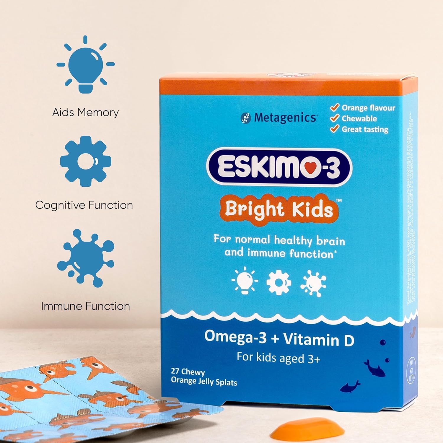 Omega-3 & Vitamin D: Chewy natural orange flavoured omega-3 jelly splats providing 270mg of DHA & 400IU of vitamin D to support healthy brain function