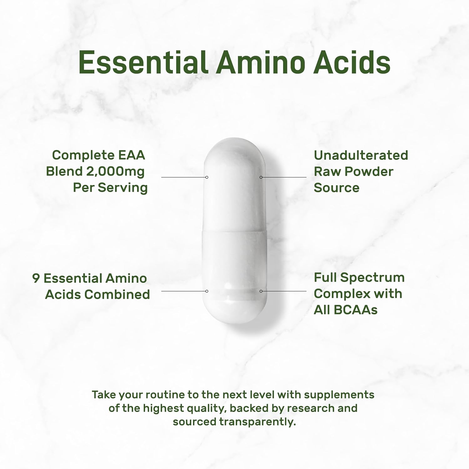 Special Features – A full spectrum EAA capsule blend of all 9 essential amino acids with complete BCAAs, 2,000mg per serving, derived from unadulterated raw amino acid powder