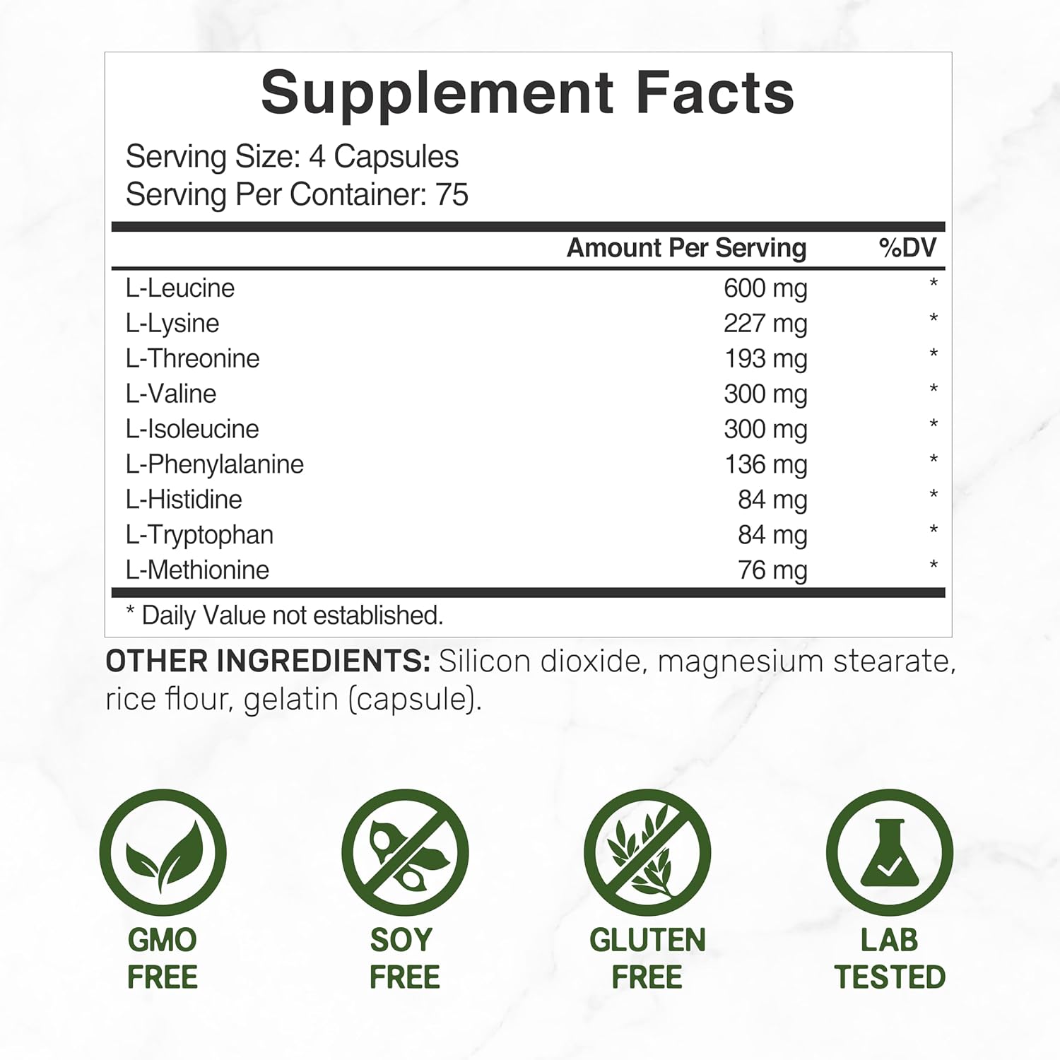 Dosage & Servings – 300 capsules per bottle, 4 capsule serving size, contains 600mg L-Leucine, 300mg L-Isoleucine, 300mg L-Valine, 84mg L-Tryptophan, 193mg L-Threonine, 136mg L-Phenylalanine, 84mg L-Histidine, 227mg L-Lysine, and 76mg L-Methionine per dose