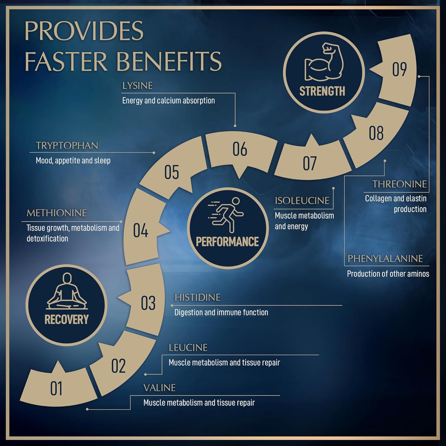 About this item ADVANCED AMINO ACID COMPLEX. All 9 pure bcaas amino acids: histidine, isoleucine, leucine, lysine, methionine, phenylalanine, threonine, tryptophan, valine. Branch chain amino acid supplement to support your health and fitness goals. RAPID BCAA ENERGY & post workout recovery amino complex. Branched chain amino acids capsules (BCAA amino acids) may enhance power & endurance by supporting protein synthesis, lean muscle tissue growth, and repair. MADE IN THE USA with premium global materials. Our eea amino acids produced with vegan, non-GMO, gluten-free ingredients in cGMP facilities. So you can be confident of getting unbeatable, and body-optimized aminos. ESSENTIAL AMINOS. BCAA EAA capsules for energy and performance. Rapidly absorbed and easy to swallow EAAs amino acids supplement for women and men for essential amino energy, power, endurance, and recovery support. ADVANCED AMINO FORMULA. Provides hard-to-find nutrition for those following a vegan or plant-based diet. Complete amino acid supplements for energy, skin health and general wellness for men & women. See more product details,ADVANCED AMINO ACID COMPLEX. All 9 pure bcaas amino acids: histidine, isoleucine, leucine, lysine, methionine, phenylalanine, threonine, tryptophan, valine. Branch chain amino acid supplement to support your health and fitness goals,RAPID BCAA ENERGY & post workout recovery amino complex. Branched chain amino acids capsules (BCAA amino acids) may enhance power & endurance by supporting protein synthesis, lean muscle tissue growth, and repair,MADE IN THE USA with premium global materials. Our eea amino acids produced with vegan, non-GMO, gluten-free ingredients in cGMP facilities. So you can be confident of getting unbeatable, and body-optimized aminos,ESSENTIAL AMINOS. BCAA EAA capsules for energy and performance. Rapidly absorbed and easy to swallow EAAs amino acids supplement for women and men for essential amino energy, power, endurance, and recovery support,ADVANCED AMINO FORMULA. Provides hard-to-find nutrition for those following a vegan or plant-based diet. Complete amino acid supplements for energy, skin health and general wellness for men & women