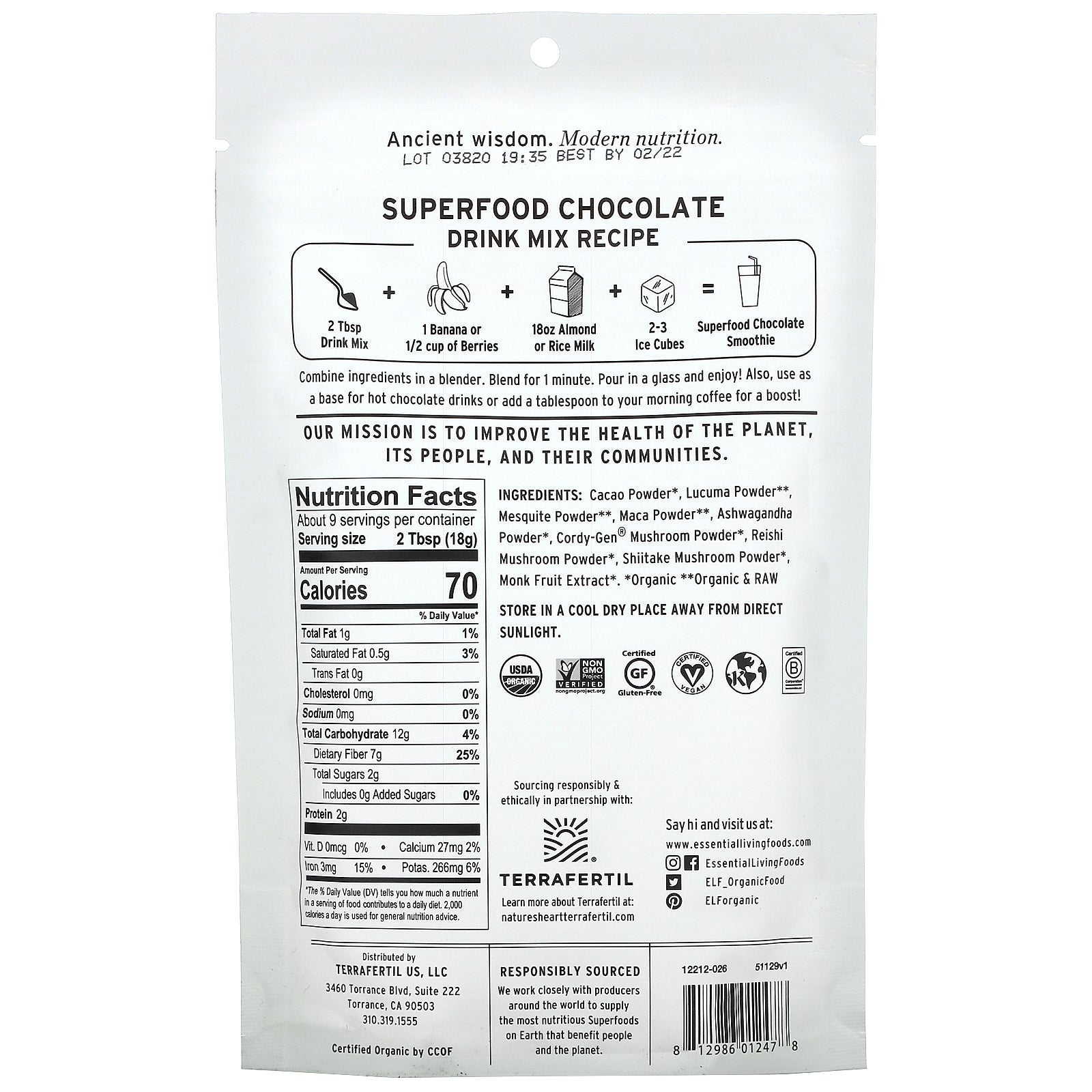 Essential Living Foods, Organic Superfood Chocolate Drink Mix