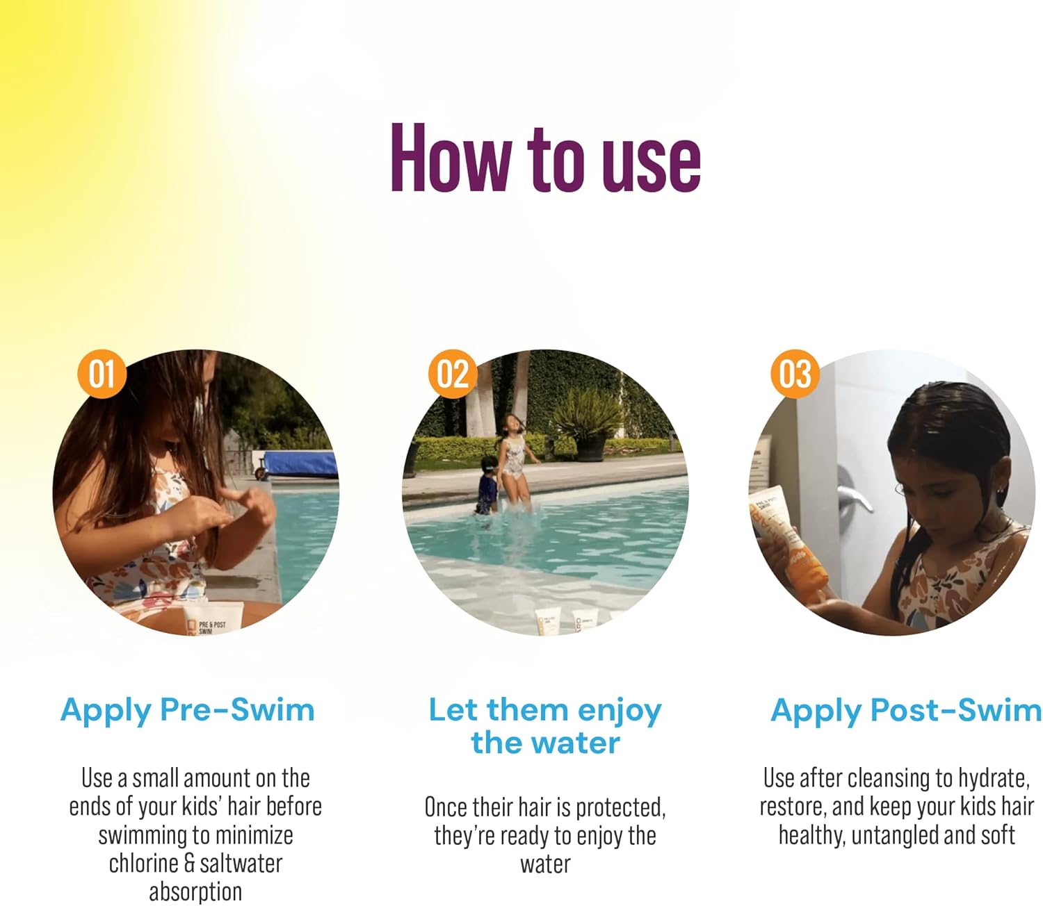 Conditioner detangles and smooths hair before and after swimming, helping prevent knots and breakage for soft, swim-ready hair
