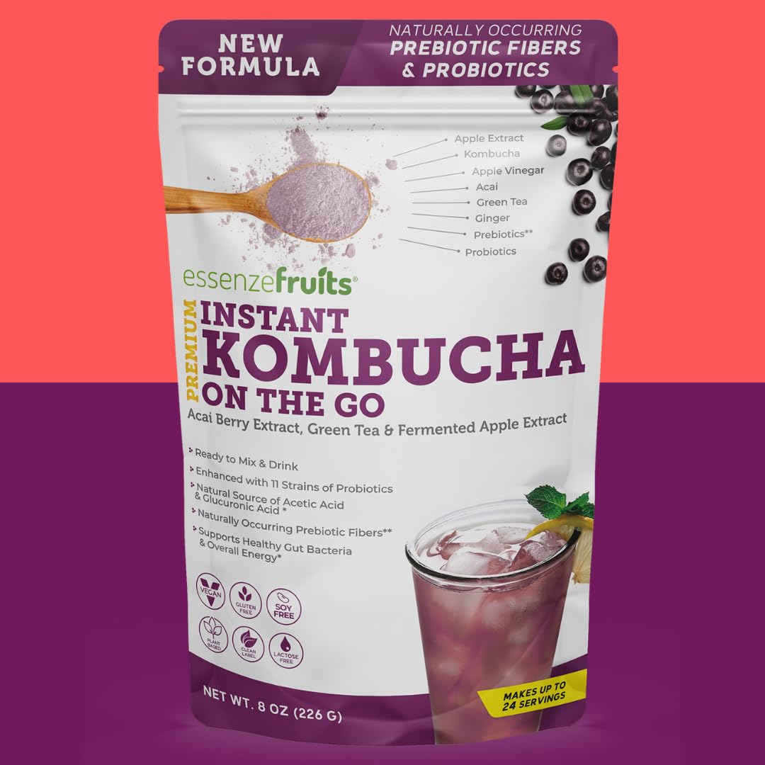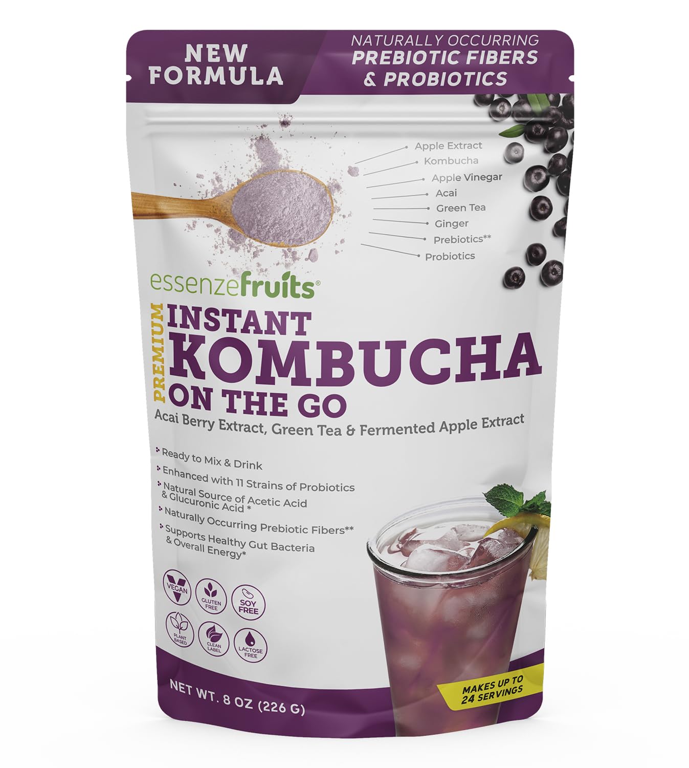 Essenzefruits Acai Kombucha Tea Powder Mix Beverage – Sugar Free, Fermented & Dried - Just Add Water! Live Probiotics & Prebiotic Blend, Vitamin C - Makes Up To 30 Cups (8 Oz, 226G)