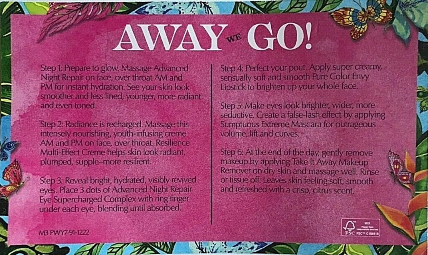 ABOUT THE PRODUCT: 1 > Estée Lauder 24-Hour Lift & Hydrate System 7 Pcs gift set includes: 2 > Resilience Multi-Effect Face and Neck Creme SPF15 0.5 Oz, Advanced Night Repair Face Serum 0.23 Oz 3 > Take It Away Makeup Remover Lotion 1 fl oz, Advanced Night Repair Eye Supercharged Complex 0.17 OzEstée Lauder 24-Hour Lift & Hydrate System 7 pcs gift set includes: Resilience Multi-Effect Face and Neck Creme SPF15 :0.5 oz/15mL, Advanced Night Repair Face Serum: 0.23 Oz7mL, Take It Away Makeup Remover Lotion: 1 fl Oz/30mL, Advanced Night Repair Eye Supercharged Complex: 0.17 Oz/5mL, Pure Color Envy Lipstick in 220 Powerful 0.12oz/3.5g (Full-Size), Sumptuous Extreme Mascara in Extreme Black 0.1 Oz and Exclusive Pink Cosmetic Bag with Butterflies