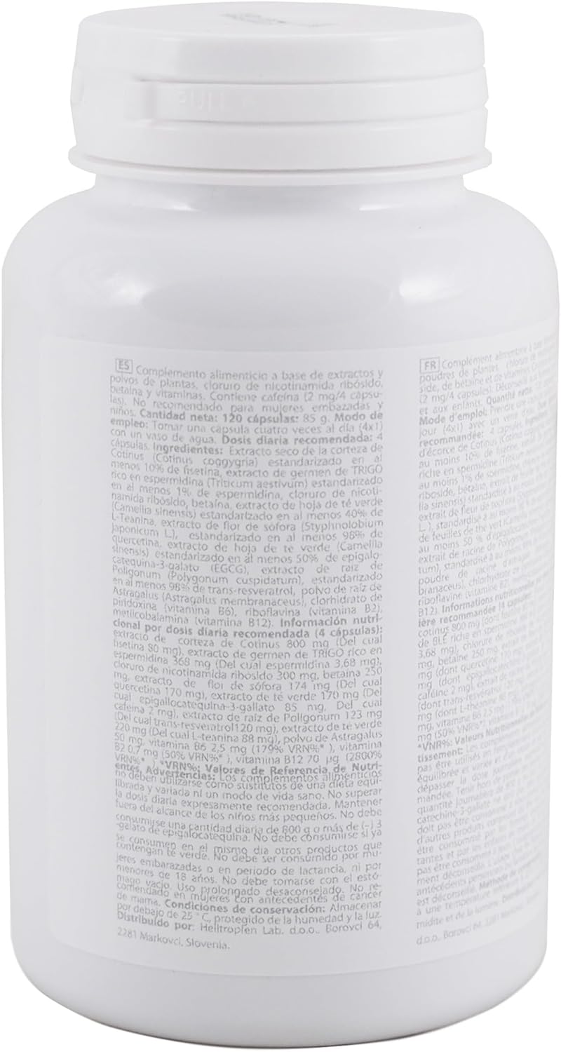 Carefully selected natural active ingredients: Fisetin, Spermidine, Nicotinamide Riboside Chloride, TMG (Trimethylglycine / Betaine), EGCG (Epigallocatechin Gallate), L-Theanine, Trans-Resveratrol, Astragalus Root Powder, Quercetin, Vitamin B2, B6, and B12