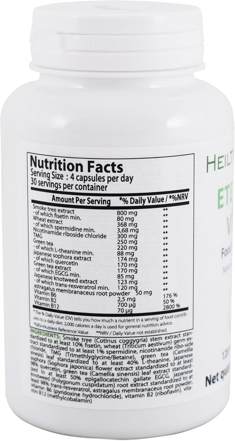 About this item Eternal Vital - natural ageless vitality, 12-compound complex, 120 veggie capsules, dietary supplement, 3 oz. - 85g Carefully selected natural active ingredients: Fisetin, Spermidine, Nicotinamide Riboside Chloride, TMG (Trimethylglycine / Betaine), EGCG (Epigallocatechin Gallate), L-Theanine, Trans-Resveratrol, Astragalus Root Powder, Quercetin, Vitamin B2, B6, and B12. DIRECTIONS: Take four capsules a day, with a glass of water. Do not exceed the recommended daily dose. See more product details,Eternal Vital - natural ageless vitality, 12-compound complex, 120 veggie capsules, dietary supplement, 3 oz. - 85g,Carefully selected natural active ingredients: Fisetin, Spermidine, Nicotinamide Riboside Chloride, TMG (Trimethylglycine / Betaine), EGCG (Epigallocatechin Gallate), L-Theanine, Trans-Resveratrol, Astragalus Root Powder, Quercetin, Vitamin B2, B6, and B12,DIRECTIONS: Take four capsules a day, with a glass of water. Do not exceed the recommended daily dose