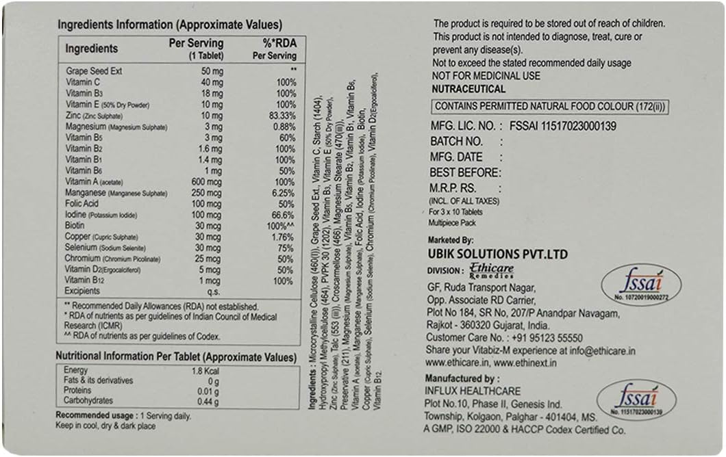 Ethiglo Vitabiz M Tablets (3 X 10 Tablets) : Multi-Vitamin And Multi-M
