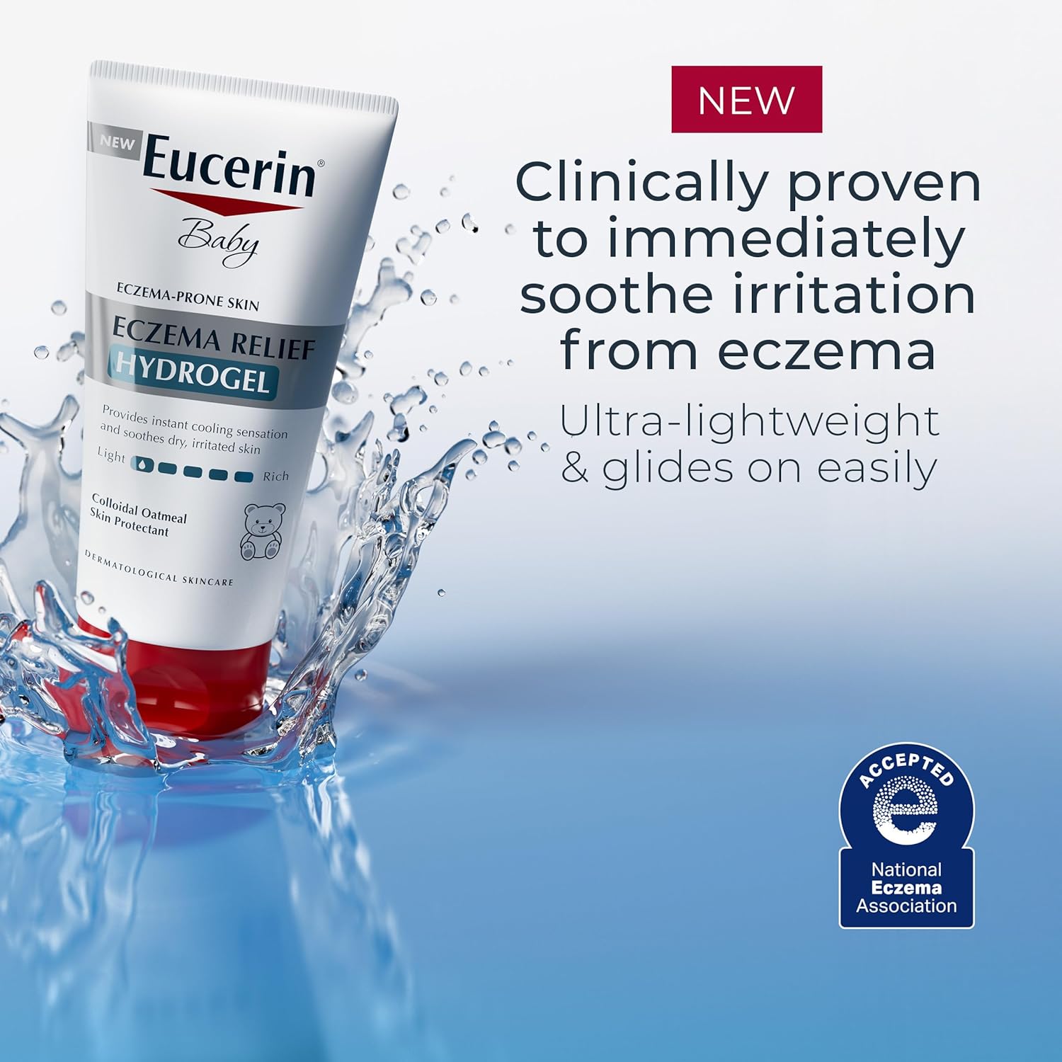 Eucerin Baby Eczema Relief Hydrogel is a clinically proven formula that immediately soothes irritation from eczema on baby's skin. This dry skin moisturizer for eczema is formulated with Colloidal Oatmeal (a skin protectant), Ceramide-3, Licochalcone A and Hyaluronic Acid; and it locks in moisture, soothes red, irritated eczema-prone skin, and intensively moisturizes. The hydrogel delivers effective results like an eczema cream, but is ultra-lightweight and leaves no greasy feeling. 98% of Parents agree that Eucerin Baby Eczema Relief Hydrogel is easy to apply and glides on skin(1), and 9/10 Parents agree that applying the hydrogel is a soothing experience.(1) This body moisturizer for dry skin, eczema itch relief, and minor eczema symptom relief is steroid- and fragrance-free; and gentle enough for daily use on baby's delicate skin. Eucerin Baby Eczema Relief Hydrogel is appropriate for use on adults, children and babies 3 months and older. Eucerin has a range of baby products for eczema-prone skin. For bath time, add Eucerin Baby Eczema Relief Cream & Body Wash to your baby's eczema treatment routine. Eucerin Baby skin care products feature eective and gentle formulas for baby's skin. (1)Eczema In Use Study, 131 participants,SOOTHING BABY SKIN CARE: Formulated with Colloidal Oatmeal (a skin protectant), Ceramide-3, Licochalcone A and Hyaluronic Acid,ECZEMA DRY ITCHY SKIN RELIEF: Ultra-lightweight moisturizer immediately soothes irritation from eczema and provides an instant soothing cool sensation when applied to dry, itchy skin,BODY AND FACE: Non-comedogenic moisturizer (won't clog pores); Eucerin Eczema Relief Hydrogel is suitable for use on the body and face,FORMULATED WITHOUT: These baby skin care products are free from steroids, fragrances, dyes and parabens; and appropriate for use on adults, children, and babies 3 months and older,24-HOUR HYDRATION: This baby moisturizer for dry skin delivers 24-hour hydration and helps to strengthen the skin's protective barrier with regular use,INCLUDES: One 5 fluid ounce tube of Eucerin Baby Eczema Relief Hydrogel for Eczema-Prone Skin, Accepted by the National Eczema Association (NEA)