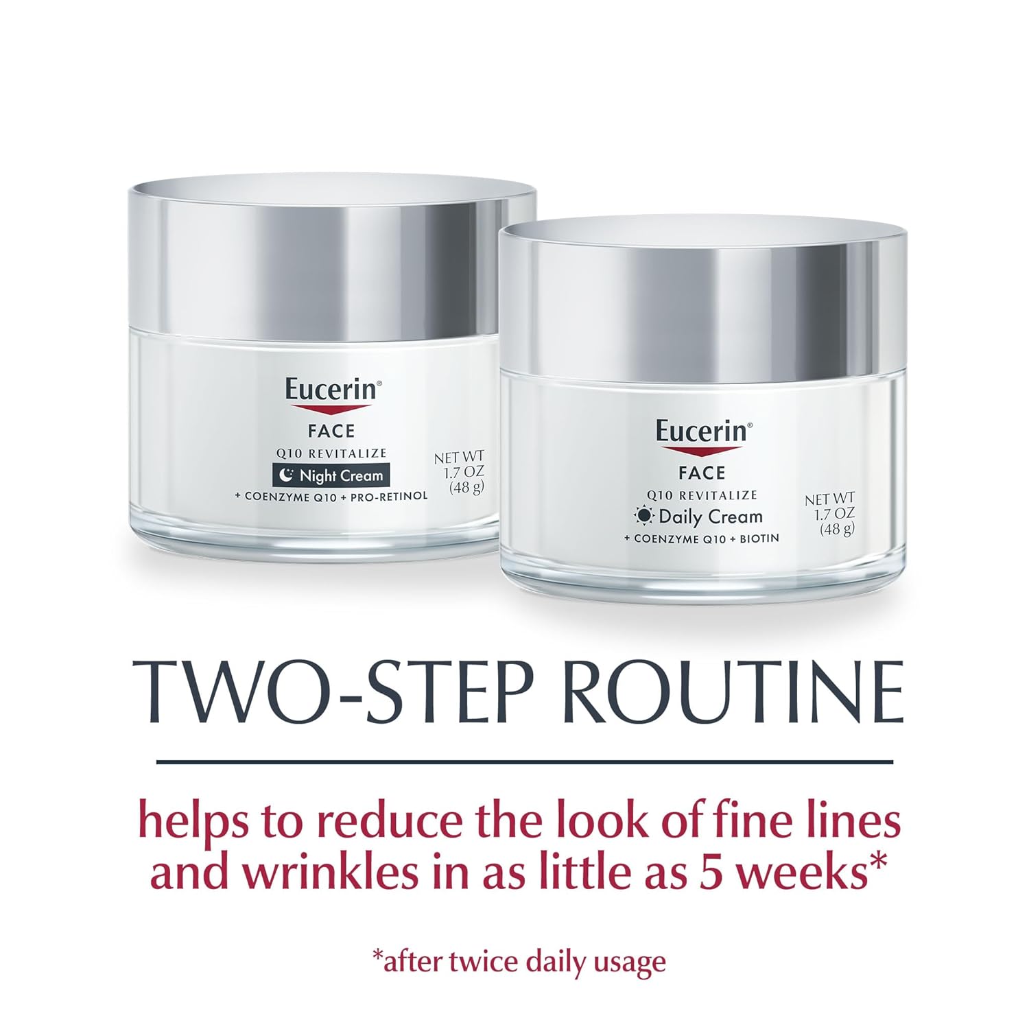 About this item FINE LINES AND WRINKLES: Face cream helps to improve the appearance of fine lines & wrinkles in as little as 5 weeks (when used twice daily) SOFTER SKIN: These face creams moisturize for softer, smoother looking skin ENRICHED WITH: Face moisturizer enriched with antioxidants, Vitamin E, and Beta-Carotene, Q10 EUCERIN SKIN CARE: Eucerin products are designed to protect, repair, and enhance the healthy look and feel of skin INCLUDES: One 1.7 ounce jar of Eucerin Q10 Anti Wrinkle Face Cream and one 1.7 ounce jar of Eucerin Q10 Anti Wrinkle Night Face Cream See more product details,FINE LINES AND WRINKLES: Face cream helps to improve the appearance of fine lines & wrinkles in as little as 5 weeks (when used twice daily),SOFTER SKIN: These face creams moisturize for softer, smoother looking skin,ENRICHED WITH: Face moisturizer enriched with antioxidants, Vitamin E, and Beta-Carotene, Q10,EUCERIN SKIN CARE: Eucerin products are designed to protect, repair, and enhance the healthy look and feel of skin,INCLUDES: One 1.7 ounce jar of Eucerin Q10 Anti Wrinkle Face Cream and one 1.7 ounce jar of Eucerin Q10 Anti Wrinkle Night Face Cream