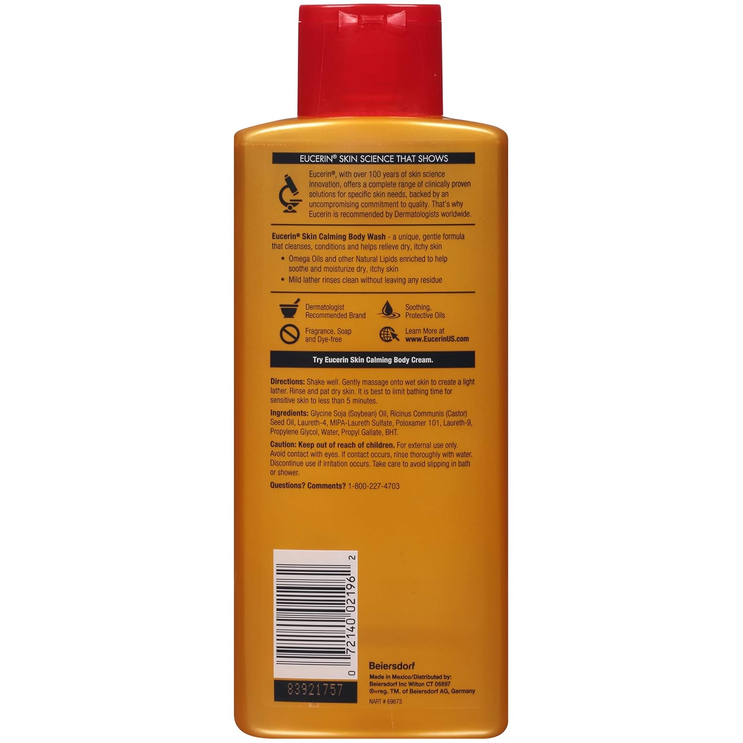 About this item Eucerin Skin Calming Body Wash offers a unique, gentle formula that cleanses, conditions and helps relieve dry, itchy skin. Omega Oils and other Natural Lipids enriched to help sooth and moisturize dry, itchy skin Mild lather rinses clean without leaving any residue Fragrance, Soap and Dye-free Dermatologist recommended brand Dermatologist Recommended: Eucerin is a dermatologist-recommended skincare brand that is based on an uncompromising approach to science See more product details,Eucerin Skin Calming Body Wash offers a unique, gentle formula that cleanses, conditions and helps relieve dry, itchy skin,Omega Oils and other Natural Lipids enriched to help sooth and moisturize dry, itchy skin,Mild lather rinses clean without leaving any residue,Fragrance, Soap and Dye-free,Dermatologist recommended brand,Dermatologist Recommended: Eucerin is a dermatologist-recommended skincare brand that is based on an uncompromising approach to science