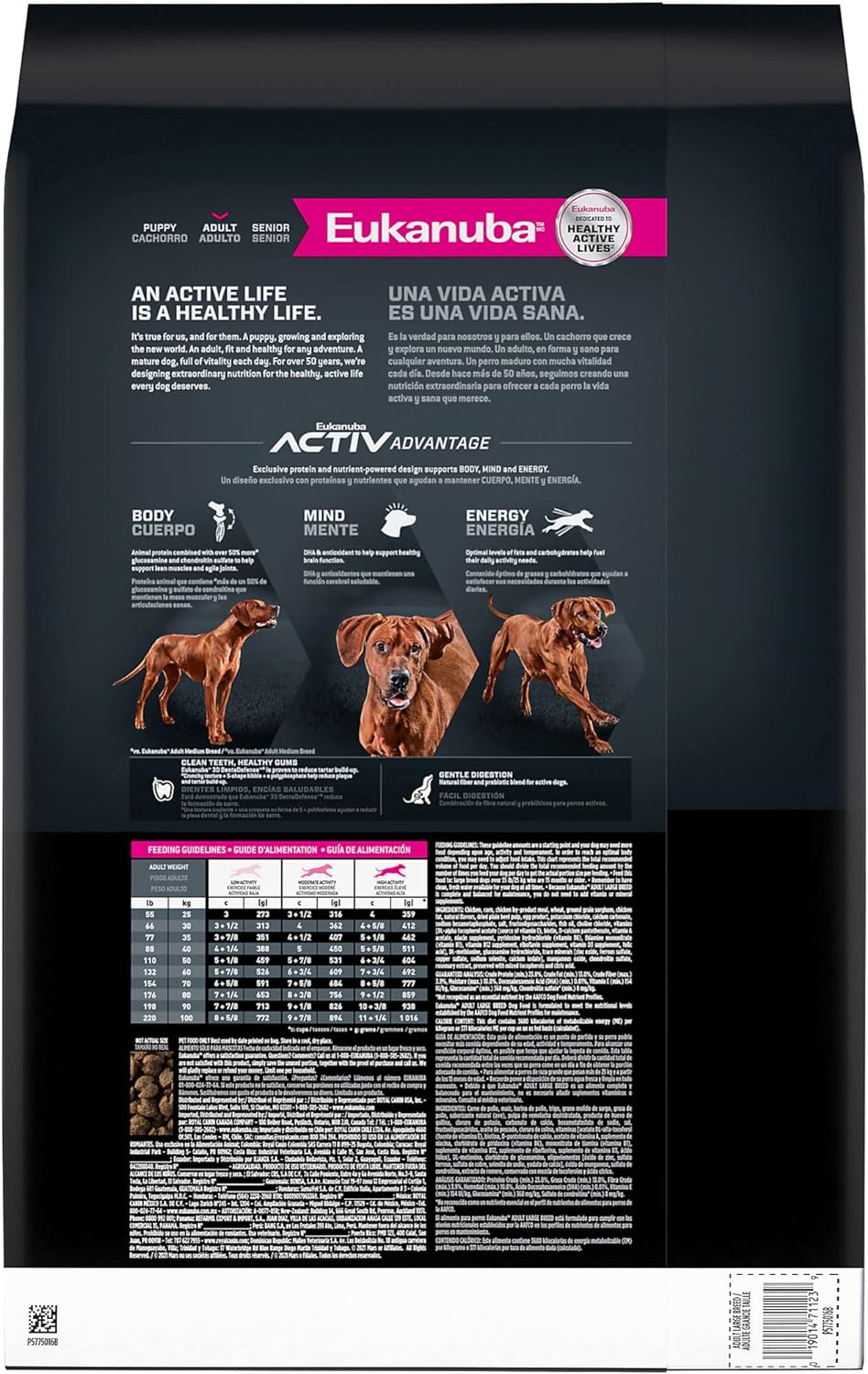 Your Large Breed Dog Is Anything But Ordinary, And Can Benefit From Extraordinary Nutrition To Help Them Perform Their Best. Fuel Your Lively Companion'S Body, Mind, And Energy With Eukanuba(Tm) Adult Large Breed Dog Food Dry Formula. Animal Protein, Glucosamine, And Chondroitin Sulfate Support Lean Muscles And Agile Joints. Dha And Vitamin E Help Support Healthy Brain Function. Optimal Levels Of Fats And Carbohydrates In This Healthy Dog Food Help Fuel An Active Lifestyle. The Crunchy Texture, S-Shaped Kibble And A Polyphosphate In The 3D Dentadefense Reduce Tartar Buildup For Clean Teeth And Healthy Gums. A Prebiotic Blend With Natural Fiber For Dogs Aids Gentle Digestion To Help Keep Your Large Breed Dog Healthy. Plus, High-Quality Chicken Is The First Ingredient In This Adult Dog Food To Power Your Big Dog'S Day. Pair This Kibble With Eukanuba Adult Wet Dog Food For The Perfect Complement. Your Dog Helps Make Your Life Extraordinary. Return The Favor By Feeding Them Eukanuba And Fuel The Extraordinary In Every Day, Satisfaction Guaranteed