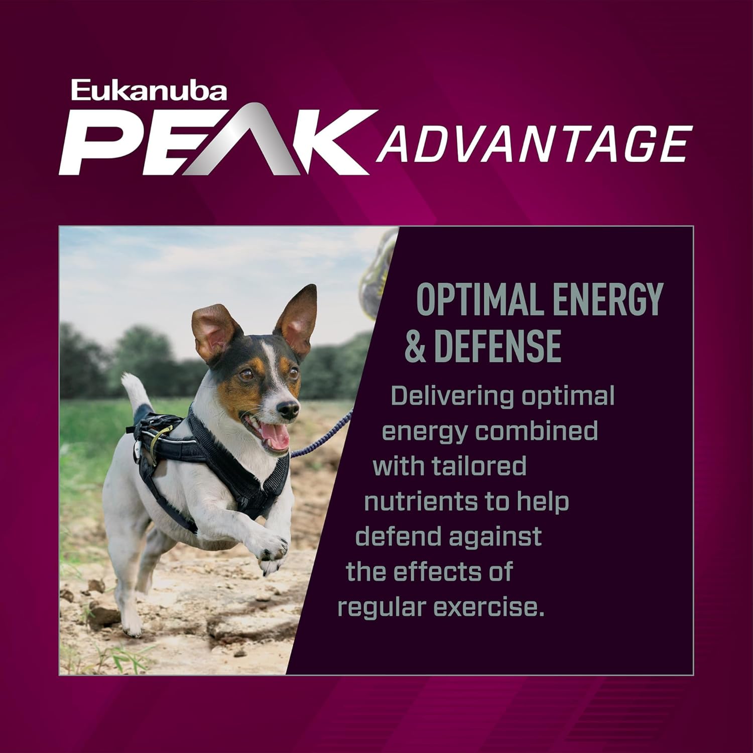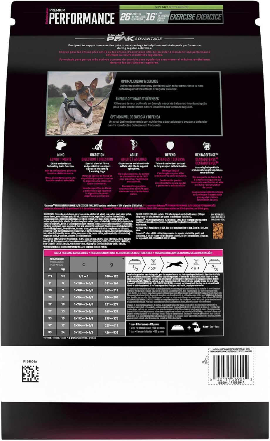 Eukanuba Premium Performance 26/16 Exercise Small Bites Dry Dog Food for adult dogs delivers optimal energy for active dogs who are on the go running, hiking, or assisting as a service dog