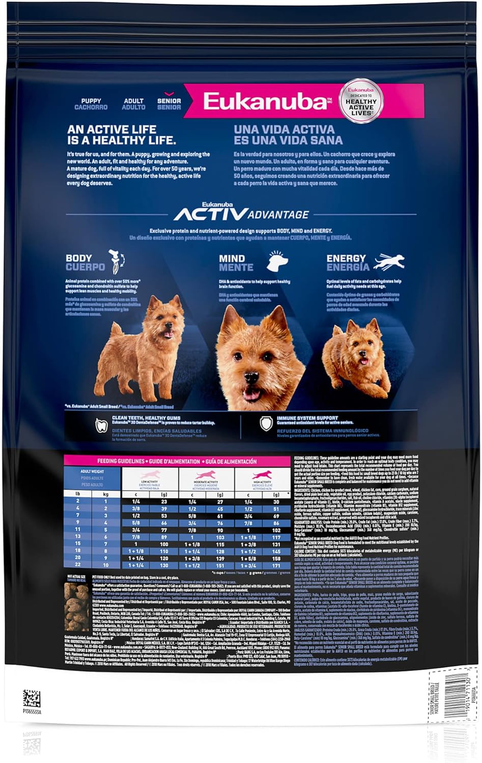 Your Small Dog Is Up For Anything, From Running To Hiking To Fetching, And ItāLl Take More Than Age To Slow Them Down. Power Their Active Lifestyle With Eukanuba Senior Small Breed Dry Dog Food, A Diet Created Specifically For Your Aging DogāS Body, Mind, And Energy. High-Quality Chicken Is Always The First Ingredient, Because Your Lively Senior Deserves High-Quality Protein. Help Keep Your Senior DogāS Joints And Muscles Limber With Glucosamine And Chondroitin Sulfate, And Help Them Stay Sharp With Dha And Antioxidants To Support Healthy Brain Function. This Senior Dog Food Diet Is Formulated With Optimal Amounts Of Fats And Carbohydrates To Help Maintain Your Older DogāS Energy Levels. Eukanuba 3D Dentadefense Supports Dog Dental Care By Reducing Tartar Buildup To Keep Their Teeth And Gums Healthy. This Senior Small Breed Dry Dog Food Also Provides Immune System Support To Help Strengthen Your Dog'S Natural Defenses. Mix The Small Dog Food Kibble With Eukanuba Adult Wet Dog Food For The Perfect Complement To Your Active DogāS Diet. Your Hardworking Dog Is No Ordinary Senior, So Feed Them Eukanuba Senior Small Breed Dry Dog Food And Make Their Golden Years The Start Of An Extraordinary New Adventure, Satisfaction Guaranteed