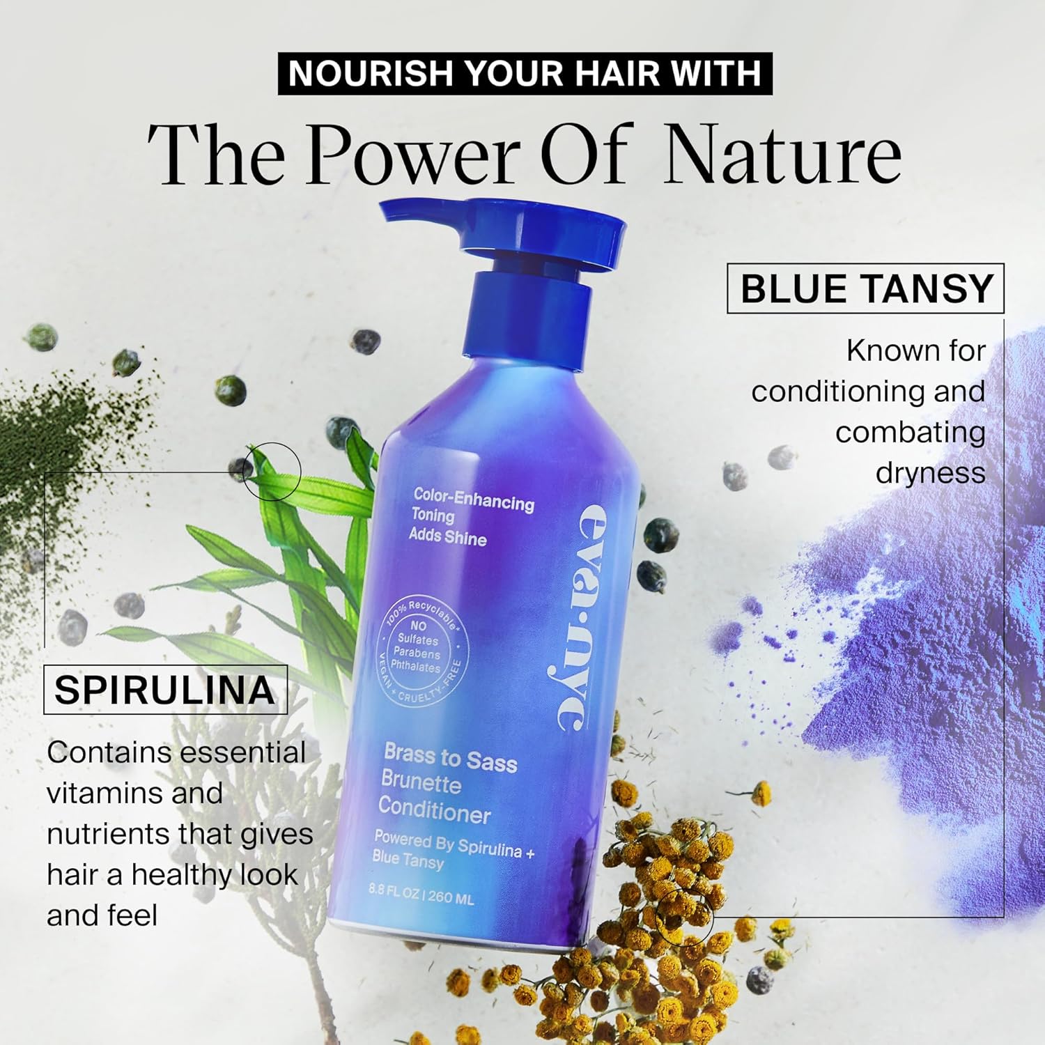 About this item For Salon-Like Brunette Hair - Restore your hair’s radiance with our Brass to Sass toning shampoo. This blue shampoo for brunettes refreshes your hair’s deep brunette color with its bright blue hue, eliminating brassy red and orange tones. Enjoy a salon-worthy look every time! Softens and Moisturizes Your Hair - This blue shampoo contains Blue Tansy, which produces natural blue oil to condition and combat dryness. It is also nutrient-rich, free of sulfates, and ultra-moisturizing to keep all hair types feeling touchably soft. Nourishes from Scalp to Ends - Using our shampoo for brunettes is an excellent way to give your hair some TLC. This blue toning shampoo contains Spirulina and Juniper Berry. They feed each strand with fatty acids, vitamins, and amino acids to give hair a healthy look and feel. Works on Natural and Colored Hair - Neutralize red and orange tones when you use our brunette shampoo. It acts as a blue toner for orange hair and is suitable for natural, highlighted, or dyed brunette hair, plus keratin, Brazilian, and color-treated ones. This blue shampoo for brunettes smells amazing, too! A Vegan Shampoo Formula You Can Trust - Cruelty-free and non-GMO, Eva NYC hair products contain no parabens, sulfates, or phthalates. This blue shampoo will give your hair the exceptional care it deserves. See more product details,For Salon-Like Brunette Hair - Restore your hair’s radiance with our Brass to Sass toning shampoo. This blue shampoo for brunettes refreshes your hair’s deep brunette color with its bright blue hue, eliminating brassy red and orange tones. Enjoy a salon-worthy look every time!,Softens and Moisturizes Your Hair - This blue shampoo contains Blue Tansy, which produces natural blue oil to condition and combat dryness. It is also nutrient-rich, free of sulfates, and ultra-moisturizing to keep all hair types feeling touchably soft,Nourishes from Scalp to Ends - Using our shampoo for brunettes is an excellent way to give your hair some TLC. This blue toning shampoo contains Spirulina and Juniper Berry. They feed each strand with fatty acids, vitamins, and amino acids to give hair a healthy look and feel,Works on Natural and Colored Hair - Neutralize red and orange tones when you use our brunette shampoo. It acts as a blue toner for orange hair and is suitable for natural, highlighted, or dyed brunette hair, plus keratin, Brazilian, and color-treated ones. This blue shampoo for brunettes smells amazing, too!,A Vegan Shampoo Formula You Can Trust - Cruelty-free and non-GMO, Eva NYC hair products contain no parabens, sulfates, or phthalates. This blue shampoo will give your hair the exceptional care it deserves