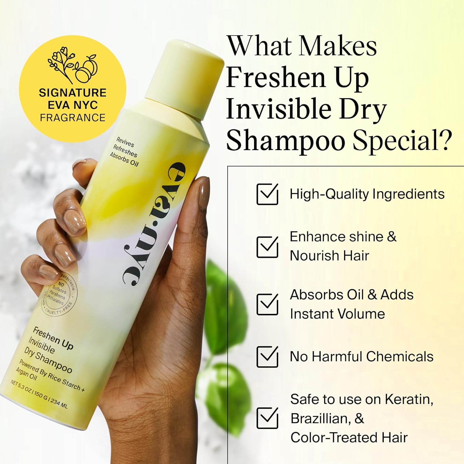 About this item Cleans Without Washing - Achieve a fresh and bouncy look with Freshen Up Invisible Dry Shampoo. Our weightless dry shampoo spray keeps all hair types looking fresh longer without washing by absorbing excess oil and odor. Keep this Eva NYC dry shampoo handy to instantly refresh your hair without a full wash day. Revives Hair, Even on Day 3 - Struggling to squeeze a wash day into your busy day Our dry shampoo for dark hair and light hair keeps your hair fresh for longer. With revitalizing ingredients, this natural dry shampoo revives lifeless hair and gives you that just-washed look, even on day 3. Clean & Non Toxic Ingredients - Give your hair some love with our dry shampoo for women. This volumizing dry shampoo contains argan oil and rice starch to help moisturize and keep hair looking and feeling healthy. It’s the perfect dry shampoo brunette and blonde people will love. Leaves No White Residue - Forget about dry shampoos that leave a white cast on your hair. Our dry shampoo for blonde hair and dark hair has an invisible formula that leaves no residue after use. Simply spray the dry shampoo mist 10–12 inches away from the scalp for a clean, just-washed look. A Vegan Dry Shampoo You Can Trust - Eva NYC hair products contain no parabens, sulfates, or phthalates. This nourishing dry shampoo is free from harsh chemicals and will give your hair the exceptional care it deserves. See more product details,Cleans Without Washing - Achieve a fresh and bouncy look with Freshen Up Invisible Dry Shampoo. Our weightless dry shampoo spray keeps all hair types looking fresh longer without washing by absorbing excess oil and odor. Keep this Eva NYC dry shampoo handy to instantly refresh your hair without a full wash day,Revives Hair, Even on Day 3 - Struggling to squeeze a wash day into your busy day Our dry shampoo for dark hair and light hair keeps your hair fresh for longer. With revitalizing ingredients, this natural dry shampoo revives lifeless hair and gives you that just-washed look, even on day 3,Clean & Non Toxic Ingredients - Give your hair some love with our dry shampoo for women. This volumizing dry shampoo contains argan oil and rice starch to help moisturize and keep hair looking and feeling healthy. It’s the perfect dry shampoo brunette and blonde people will love,Leaves No White Residue - Forget about dry shampoos that leave a white cast on your hair. Our dry shampoo for blonde hair and dark hair has an invisible formula that leaves no residue after use. Simply spray the dry shampoo mist 10–12 inches away from the scalp for a clean, just-washed look,A Vegan Dry Shampoo You Can Trust - Eva NYC hair products contain no parabens, sulfates, or phthalates. This nourishing dry shampoo is free from harsh chemicals and will give your hair the exceptional care it deserves