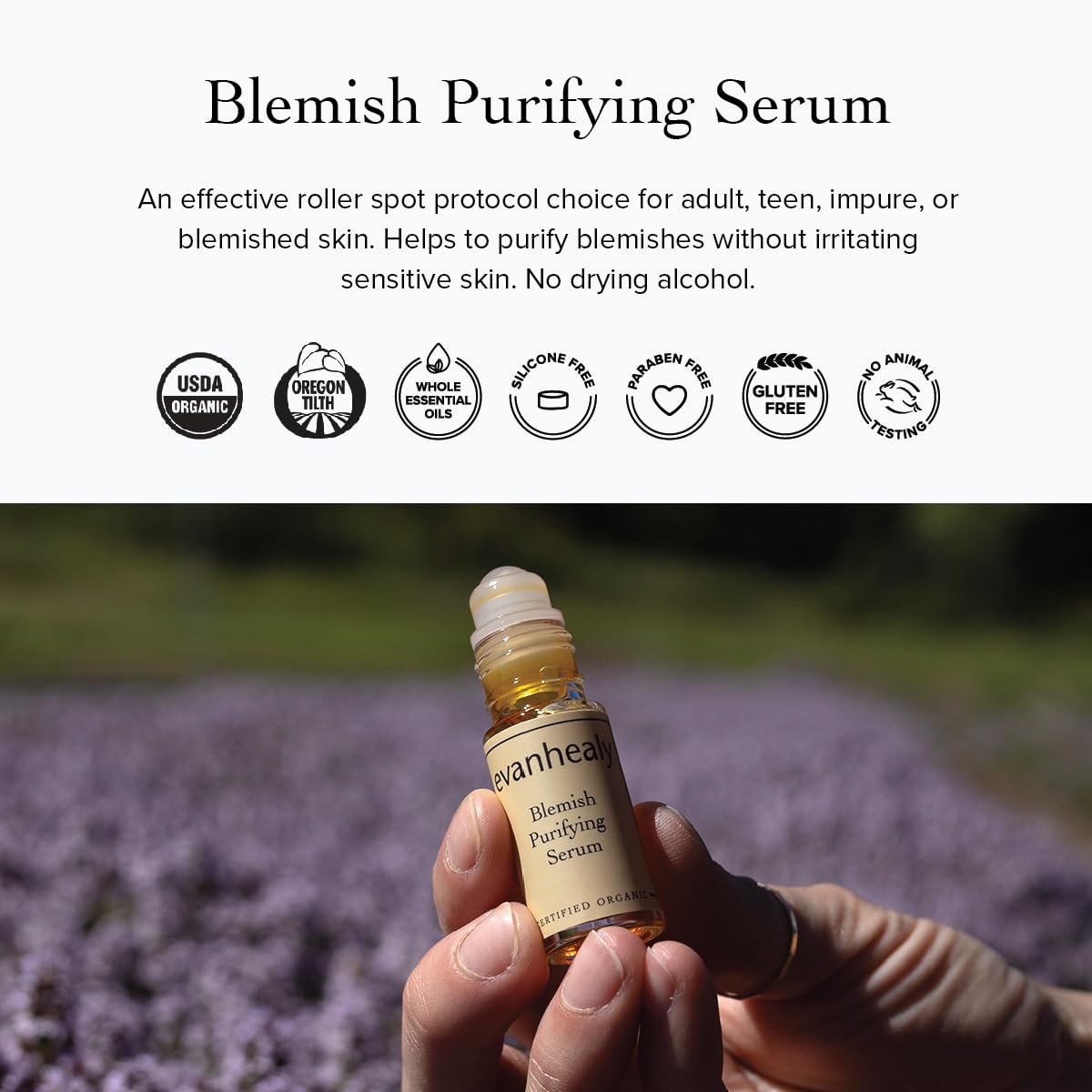 About this item BLEMISH CONTROL - The Blemish Purifying skin serum works to harmonize sebum production without drying our irritating sensitive skin. Apply it after your hydrating serum, and before a clay mask or moisturizer. ZERO ALCOHOL - Unlike other face serums, our clean and pure formulation doesn’t contain any harsh chemicals or drying alcohol. It gently draws impurities to the surface without peeling, breaking, or drying out your skin’s natural lipid barrier. BOTANICAL BRIGHTENING SERUM - Contains organic rosehip oil to brighten hyperpigmentation and acne scar, apricot kernel seed oil to soften your complexion, and jojoba, rosemary, sea buckthorn, and lavender flower oil to further balance and cleanse the skin. EASY ROLL ON - Bottled in a conveniently-sized rolling tube applicator, this face serum for glowing allows for small areas to be treated. Our health and beauty experts recommend applying it exclusively over blemish spots, avoiding rolling excessively over the face. ORGANIC SKIN CARE PRODUCTS - All evanhealy products are 100% gluten-free, non-GMO, fair trade, and cruelty free. We proudly formulate skin harmonizing essentials that are paraben free and free of synthetic fragrances. See more product details,BLEMISH CONTROL - The Blemish Purifying skin serum works to harmonize sebum production without drying our irritating sensitive skin. Apply it after your hydrating serum, and before a clay mask or moisturizer,ZERO ALCOHOL - Unlike other face serums, our clean and pure formulation doesn’t contain any harsh chemicals or drying alcohol. It gently draws impurities to the surface without peeling, breaking, or drying out your skin’s natural lipid barrier,BOTANICAL BRIGHTENING SERUM - Contains organic rosehip oil to brighten hyperpigmentation and acne scar, apricot kernel seed oil to soften your complexion, and jojoba, rosemary, sea buckthorn, and lavender flower oil to further balance and cleanse the skin,EASY ROLL ON - Bottled in a conveniently-sized rolling tube applicator, this face serum for glowing allows for small areas to be treated. Our health and beauty experts recommend applying it exclusively over blemish spots, avoiding rolling excessively over the face,ORGANIC SKIN CARE PRODUCTS - All evanhealy products are 100% gluten-free, non-GMO, fair trade, and cruelty free. We proudly formulate skin harmonizing essentials that are paraben free and free of synthetic fragrances
