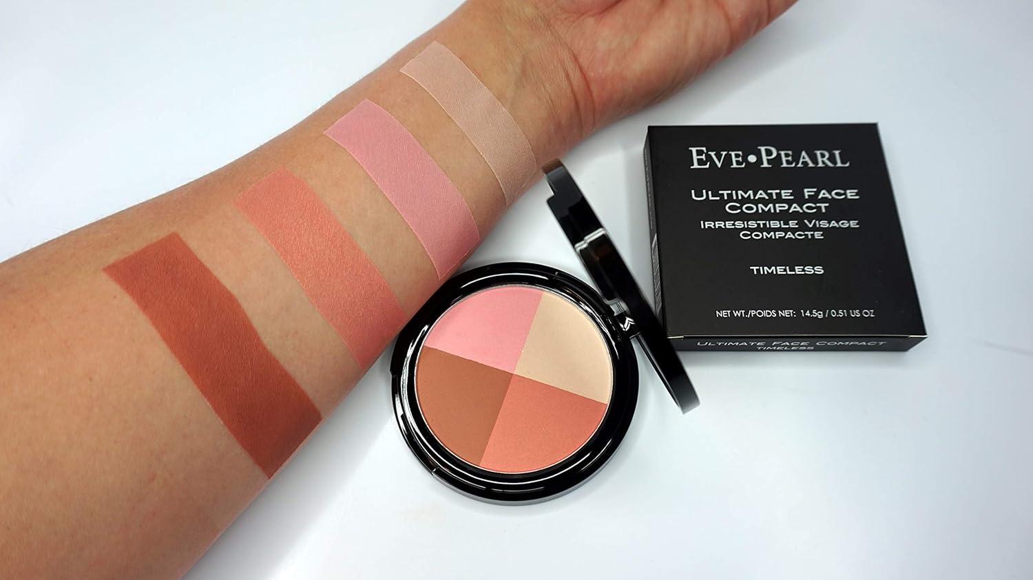 ABOUT THE PRODUCT: 1 > About the Face Compact : This Fragrance Free And Paraben Free Product Is Your Must Have Palette. Blush, Eyeshadow, Bronzer, Contour and Highlighter in ONE easy to use Slim Compact. Skin perfecting pressed powders with color adjusting pigments for a beautifully balanced complexion 2 > Those 4 shades options are all you needThe colors will do the work for you. One swipe to pick up all or use individual colors. Contour, blush, eyeshadow and highlight in one swipe. A neutral to highlight and blot. You can use the Pink and peach shades for blush and eyeshadow, or the deeper tone for contouring. Net Wt. 0.51 oz 3 > About the Brush: Ergonomically designed for ideal pick up and precise application to contour, highlight, and smooth blending. Thousands of MicroSilk synthetic fibers are 100% cruelty-free and hypoallergenicEVE PEARL ultimate face compact and 204 Dual Fan Highlighter Brush. The face compact contains shades specifically designed for options. A neutral colour helps to highlight and blot. A pink and peach can be used for blush and eye shadow, and a deeper tone helps to contour and add dimension to the eyes. Sheer silky smooth fine texture can be used to set foundation. Dab the fan side of the 204 Fan Highlighter Brush (holding it horizontally) in the center of the compact to pick-up all the correct colors to contour, blush, and highlight. Then, Smile (to locate those cheeks) and place the brush right on the lower part of your cheeks and work the fan brush back and forth. Use the small dome side of the 204 Fan Highlighter Brush to apply shadow to your eyes, to add extra highlight or contouring to your cheeks