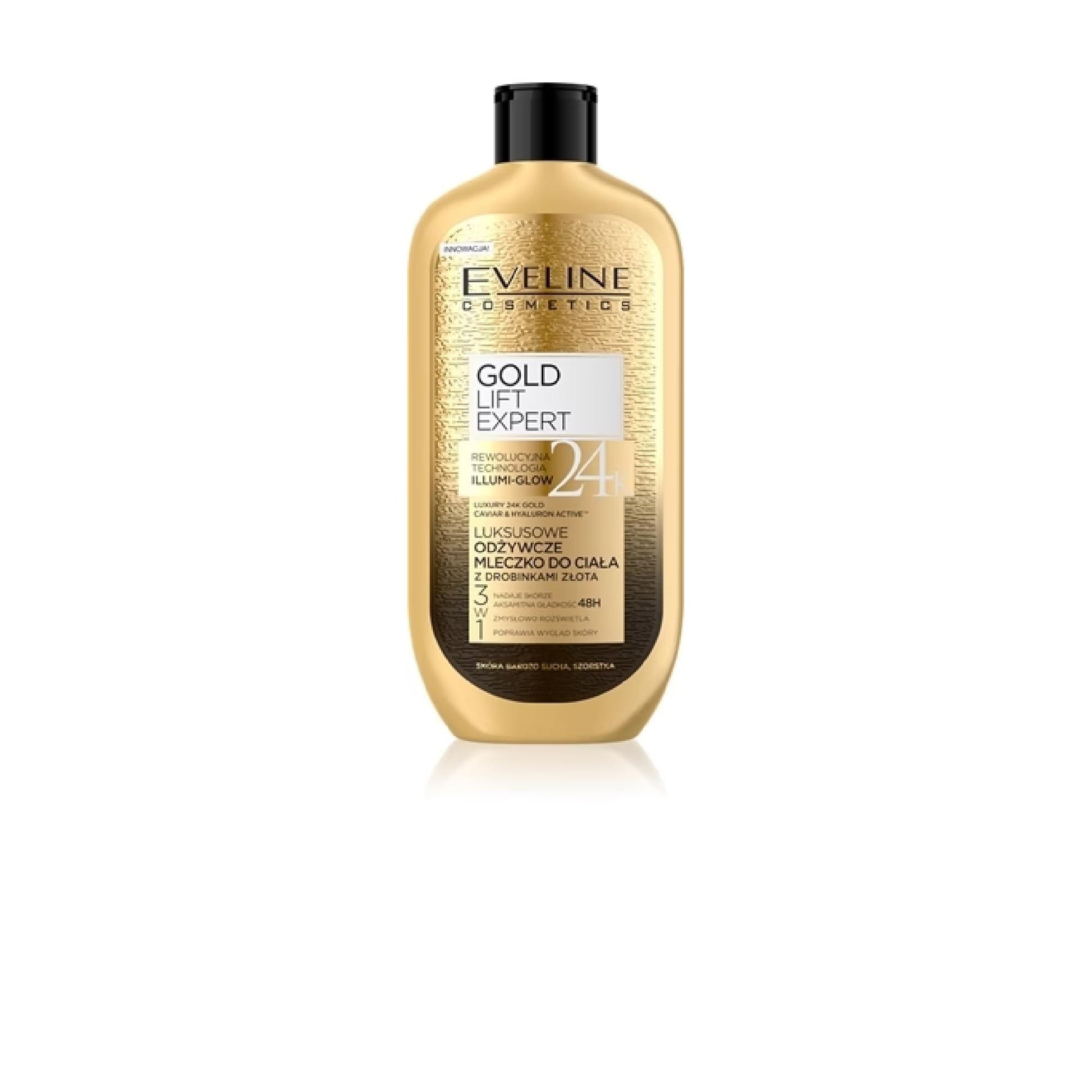 Skin Type:Dry, Corneous&Effects:Hydration, Brightening, Nourishing&Active Ingredients:Hyaluronic Acid Eveline Cosmetics Gold Lift Expert Nourishing Body Cream Features A Highly Concentrated Formula Enriched With 24-Karat Gold Particles. This Product Offers Immediate Relief To Dry, Rough And Irritated Skin While Restoring A Feeling Of Comfort. The Synergetic Power Of Its Active Ingredients Also Firms And Regenerates Your Skin And Keeps It Hydrated. Characteristics: : Brings Relief To Dry, Rough And Irritated Skin Instantly Soothes And Restores The Feeling Of Comfort Tones And Intensely Regenerates Skin Hydrates And Nourishes Ingredients: Hydra Luxury Molecular Technology – Stimulates The Natural Functions Of Your Skin; Has Nourishing, Protective And Strongly Hydrating Effects Complex With Natural Caviar And 24-Karat Gold – Nourishes And Tones Your Skin, Accelerates Skin Cell Regeneration Oil Serum (Coconut, Soy And Argan Oils; Shea Butter; Honey) – Deep Hydration, Intense Nourishment, Promotion Of Collagen And Elastin Production How To Apply: Apply The Eveline Cosmetics Gold Lift Expert Nourishing Body Cream Every Morning And Night To Clean, Dry Skin And Massage In Gently Other Information:Manufacturer/Importer: Eveline Cosmetics S.A., 66 Avenue Des Champs-Élysées, 75008 Paris, France Info.Eu@Eveline.Eu About The Brand:Class Eveline Cosmetics Eveline Cosmetics – Quality For Everyone. Eveline Cosmetics Was Founded In 1983 And Today Is One Of The Largest Cosmetics Manufacturers In Poland. With Over Three Decades On The Market, The Brand Has Expanded To More Than 70 Countries Around The World. Eveline Cosmetics Customers Can Choose From A Wide Range Of Decorative Cosmetics And Products For Face And Body Care. They Have Gained Brand Confidence Through High Quality Achieved By Years Of Experience And, At The Same Time, Their Favourable Prices. Their Rapid Reaction To New Trends And The Idea That Choosing The Right Cosmetics To Suit You Is Extremely Important Are All Part Of The Brand Philosophy. That Is Why Eveline Cosmetics Try Their Best To Reflect The Needs And Requirements Of Their Customers And Take Care That Everyone Chooses The Best Products For Themselves From Their Range. Eveline Cosmetics Means Innovation, Quality, Professionalism, And A Guarantee Of Performance Combined With A Friendly Approach To Customers And Affordability Ingredients:Ingredients Eveline Cosmetics Gold Lift Expert Complete Ingredients List Aqua (Water) Paraffinum Liquidum Cetearyl Alcohol Glycerin Glycine Soja Oil Butyrospermum Parkii Butter Cocos Nucifera Oil Stearic Acid Dimethicone Phenoxyethanol Sodium Hyaluronate Caprylic/Capric Triglyceride Ceteareth-20 Sodium Polyacrylate Parfum (Fragrance) Dmdm Hydantoin Octyldodecanol Argania Spinosa Kernel Oil Panthenol Allantoin Propylene Glycol Caviar Extract Royal Jelly Extract Gold Citric Acid Sodium Benzoate Potassium Sorbate Methylparaben Ethylparaben Butylparaben Propylparaben Mica Ci 77891 Ci 77491 Benzyl Salicylate Linalool Limonene Citronellol Hexyl Cinnamal Hydroxycitronellal Coumarin. The Manufacturer Is Responsible For The Ingredients Of The Product. We Recommend Checking The List Of Product Ingredients Directly On Its Packaging Due To Potential Changes