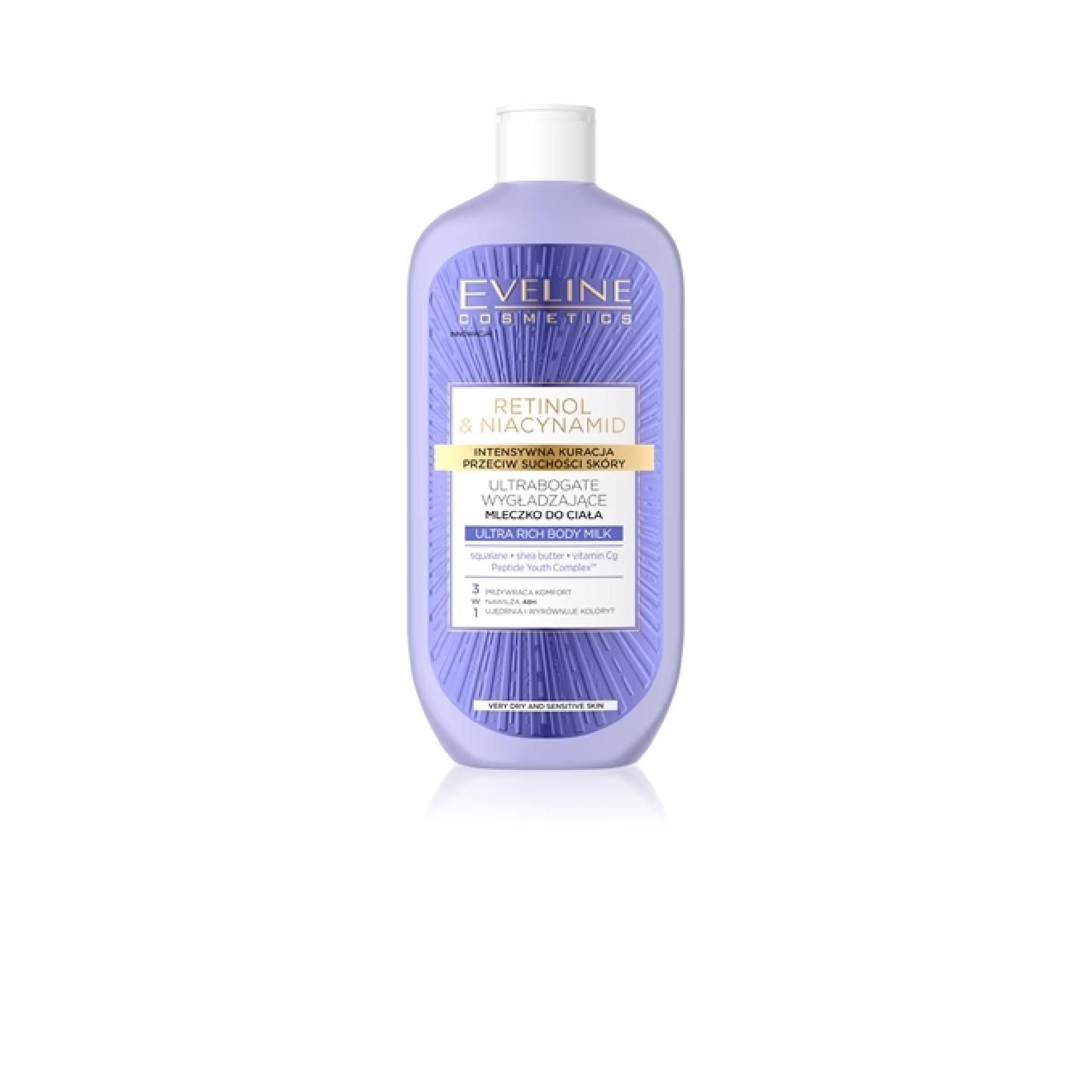 Skin Type:All Skin Types&Effects:Hydration, Nourishing, Strengthening&Active Ingredients:Retinol, Shea Butter, Niacinamide, Peptides, Squalane Coat Your Skin With The Beneficial Effects Of The Active Ingredients And Give It The Best Possible Care. The Eveline Cosmetics Retinol &Amp; Niacynamid Body Lotion Comes With A Wide Range Of Active Substances – Retinol, Niacinamide, Peptides, Shea Butter And Squalane. This Combination Will Pamper Your Body With Intensive Hydration And Nourishment. Your Skin Will Get Softness, Elasticity And A Healthy Even Tone That Will Be Visible At First Glance. Characteristics: Regenerates And Nourishes The Skin, Improves Its Elasticity Moisturises The Skin Intensively For Up To 48 Hours Leaves The Skin Beautifully Smooth And Soft Protects The Skin Against Harmful External Factors Evens The Skin Tone, Soothes Irritation Has A Light Consistency, Absorbs Fast Ingredients: Retinol And Niacinamide – Smooth The Skin And Reduce Signs Of Ageing Peptide Youth Complex™ Shea Butter Squalane How To Apply: Apply The Retinol &Amp; Niacynamid Body Lotion To The Clean And Dry Skin Of The Entire Body. Gently Massage Into The Skin Using Circular Movements Until Completely Absorbed Other Information:Important Warnings: Contains Vitamin A. Consider Your Daily Intake Before Use. Manufacturer/Importer: Eveline Cosmetics S.A., 66 Avenue Des Champs-Élysées, 75008 Paris, France Info.Eu@Eveline.Eu About The Brand:Class Eveline Cosmetics Eveline Cosmetics – Quality For Everyone. Eveline Cosmetics Was Founded In 1983 And Today Is One Of The Largest Cosmetics Manufacturers In Poland. With Over Three Decades On The Market, The Brand Has Expanded To More Than 70 Countries Around The World. Eveline Cosmetics Customers Can Choose From A Wide Range Of Decorative Cosmetics And Products For Face And Body Care. They Have Gained Brand Confidence Through High Quality Achieved By Years Of Experience And, At The Same Time, Their Favourable Prices. Their Rapid Reaction To New Trends And The Idea That Choosing The Right Cosmetics To Suit You Is Extremely Important Are All Part Of The Brand Philosophy. That Is Why Eveline Cosmetics Try Their Best To Reflect The Needs And Requirements Of Their Customers And Take Care That Everyone Chooses The Best Products For Themselves From Their Range. Eveline Cosmetics Means Innovation, Quality, Professionalism, And A Guarantee Of Performance Combined With A Friendly Approach To Customers And Affordability Ingredients:Ingredients Eveline Cosmetics Retinol &Amp; Niacynamid Complete Ingredients List Aqua (Water), Paraffinum Liquidum, Cetearyl Alcohol, Glycerin, Ceteareth-20, Petrolatum, Isopropyl Palmitate, Squalane, Butyrospermum Parkii Butter, Mangifera Indica Seed Butter, Theobroma Cacao Seed Butter, Cycnoches Cooperi Extract, Niacinamide, Retinol, Retinyl Palmitate, Allantoin, Tocopheryl Acetate, Tocopherol, Ascorbyl Glucoside, Palmitoyl Tripeptide-1, Palmitoyl Tetrapeptide-7, Hydroxypropyl Cyclodextrin, Sodium Lactate, Phenoxyethanol, Hydroxyacetophenone, Ethylhexylglycerin, Sodium Benzoate, Potassium Sorbate, Parfum (Fragrance), Acrylates/C10-30 Alkyl Acrylate Crosspolymer, Coco-Glucoside, Dimethicone, Carbomer, Butylene Glycol, Triethanolamine, Citric Acid, Benzyl Salicylate, Coumarin, Hydroxycitronellal, Linalool. The Manufacturer Is Responsible For The Ingredients Of The Product. We Recommend Checking The List Of Product Ingredients Directly On Its Packaging Due To Potential Changes