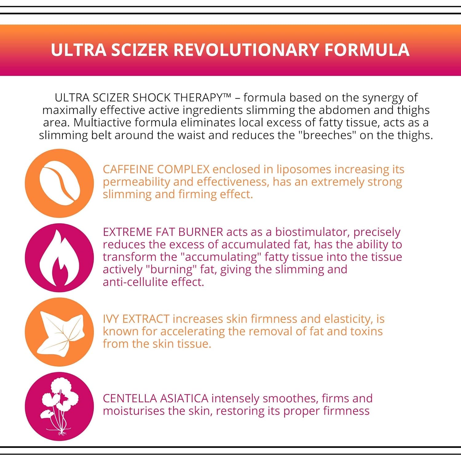 Ultra Scizer Shock Therapy - Formula Based On The Synergy Of Maximally Effective Active Ingredients Slimming The Abdomen And Thighs Area. Multiactive Formula Eliminates Local Excess Of Fatty Tissue, Acts As A Slimming Belt Around The Waist And Reduces The "Breeches" On The Thighs