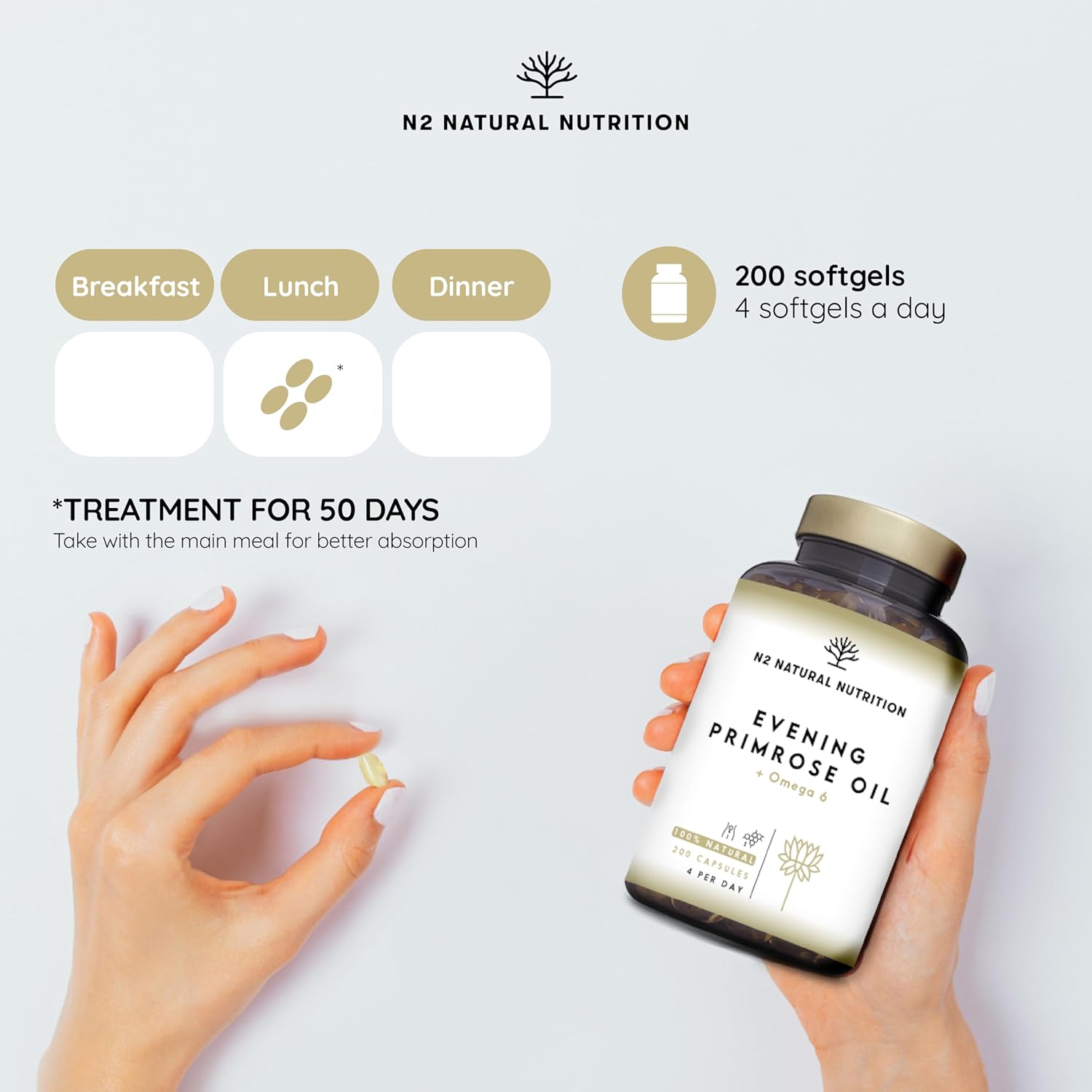 Evening Primrose Oil 2000 Mg Per Dose, Gla Omega 6 200Mg + Vitamin E. 200 High Strength Softgels, Easy Swallow, Cold Pressed. Menopause, Skin And Nails Care. Made In Eu. N2 Natural Nutrition
