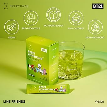 Everydaze Bt21 Reset Kombucha Tea Powdered Beverage Mix | 10 Sticks | Prebiotics + Probiotics | Vegan | No Added Sugar, Gluten Free, Sparkling Powder Drink Pack (Green Grape)