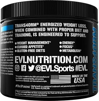 About this item Unique Complex - Forget about simple fat burner powders and choose our advanced complex that works fast for men with tried and true ingredients including L-Carnitine and CLA Carb and Cravings Support - Our full spectrum formula helps you reach your weight loss goals by supporting both hunger levels and stubborn belly fat loss for men to give you that lean figure All-In-One Diet and Weight Loss Support - Unlike many fat burning supplements on the market our unique and delicious powder also offers support for stubborn fat loss and workout energy and focus What’s Inside Trans4orm - Our specialized stomach fat burner support complex helps maximize your fitness without sacrificing muscle thanks to synergistic properties of caffeine with Huperzine A Why Evlution Nutrition - We are proud to use premium quality third party tested supplements made in cGMP facilities because you deserve nothing but the best to support your weight loss goals See more product details,Unique Complex - Forget about simple fat burner powders and choose our advanced complex that works fast for men with tried and true ingredients including L-Carnitine and CLA,Carb and Cravings Support - Our full spectrum formula helps you reach your weight loss goals by supporting both hunger levels and stubborn belly fat loss for men to give you that lean figure,All-In-One Diet and Weight Loss Support - Unlike many fat burning supplements on the market our unique and delicious powder also offers support for stubborn fat loss and workout energy and focus,What’s Inside Trans4orm - Our specialized stomach fat burner support complex helps maximize your fitness without sacrificing muscle thanks to synergistic properties of caffeine with Huperzine A,Why Evlution Nutrition - We are proud to use premium quality third party tested supplements made in cGMP facilities because you deserve nothing but the best to support your weight loss goals