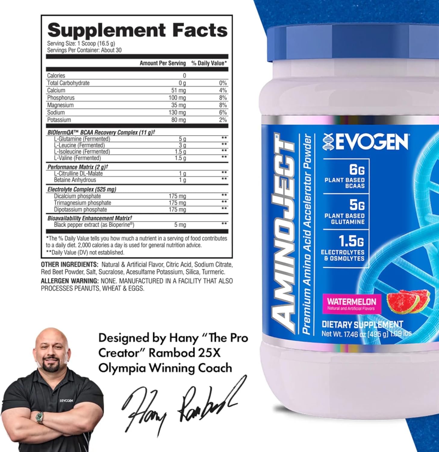 About this item ULTRA-CLEAN BCAA & EAA RECOVERY FORMULA – Evogen AminoJect combines high-quality BCAA powder with BCAAs amino acids and EAAs amino acids to accelerate muscle recovery, support protein synthesis, and fuel muscle growth during and after intense workouts. PLANT-BASED BCAAS & ESSENTIAL AMINO ACIDS – Packed with 6g fermented plant-based BCAAs and 5g pure glutamine, this formula includes essential amino acids to prevent muscle breakdown and promote optimal recovery. BOOSTS HYDRATION & PERFORMANCE – With electrolytes, osmolytic betaine, EAAs amino acids powder, and BCAAs amino acids, AminoJect enhances hydration, reduces fatigue, and helps maintain peak performance for men and women during training. SUPPORTS ENDURANCE & MUSCLE GROWTH – Featuring clinically studied ingredients like L-citrulline DL-malate and betaine, this amino acids supplement improves endurance and supports lean muscle growth. DESIGNED BY THE PRO CREATOR – Developed by Hany Rambod, 25X Olympia-winning coach, Evogen AminoJect is a science-backed recovery catalyst built for muscle hydration, recovery, and growth. Pair with an Evogen pre workout supplement for even better results. Due to Amazon’s health and safety policies, returns are not permitted for this product. If you experience any issues, please contact us directly, and we’ll be happy to help. See more product details,ULTRA-CLEAN BCAA & EAA RECOVERY FORMULA – Evogen AminoJect combines high-quality BCAA powder with BCAAs amino acids and EAAs amino acids to accelerate muscle recovery, support protein synthesis, and fuel muscle growth during and after intense workouts,PLANT-BASED BCAAS & ESSENTIAL AMINO ACIDS – Packed with 6g fermented plant-based BCAAs and 5g pure glutamine, this formula includes essential amino acids to prevent muscle breakdown and promote optimal recovery,BOOSTS HYDRATION & PERFORMANCE – With electrolytes, osmolytic betaine, EAAs amino acids powder, and BCAAs amino acids, AminoJect enhances hydration, reduces fatigue, and helps maintain peak performance for men and women during training,SUPPORTS ENDURANCE & MUSCLE GROWTH – Featuring clinically studied ingredients like L-citrulline DL-malate and betaine, this amino acids supplement improves endurance and supports lean muscle growth,DESIGNED BY THE PRO CREATOR – Developed by Hany Rambod, 25X Olympia-winning coach, Evogen AminoJect is a science-backed recovery catalyst built for muscle hydration, recovery, and growth. Pair with an Evogen pre workout supplement for even better results,Due to Amazon’s health and safety policies, returns are not permitted for this product. If you experience any issues, please contact us directly, and we’ll be happy to help