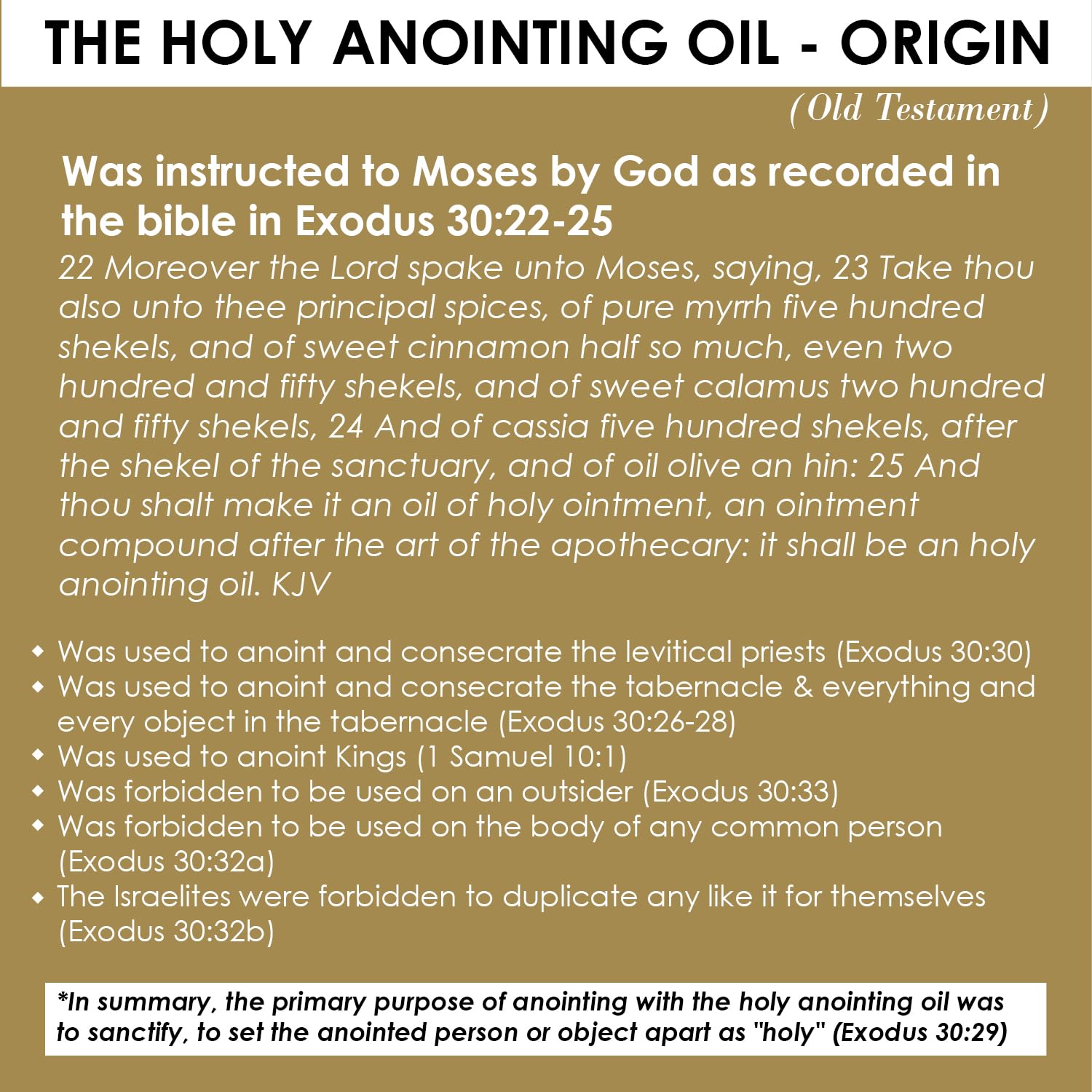 Biblical Inspiration: Exodus 30:22-25 describes the ingredients and preparation method for the holy anointing oil, used in ancient times for anointing, consecration, and prayers, especially for the sick
