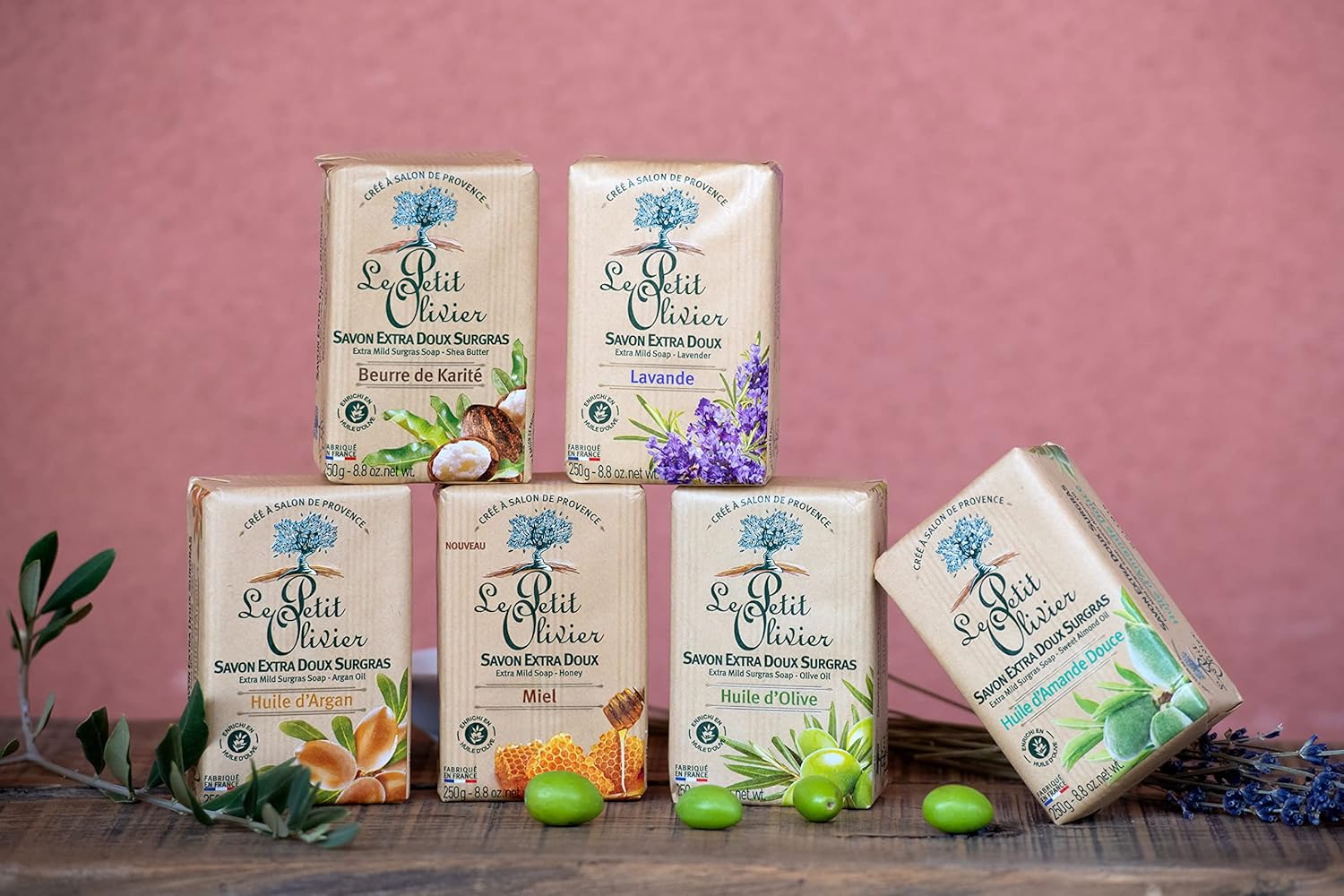 SKIN-LOVING. Enjoy Le Petit Olivier soap enriched with natural extracts to softly clean your skin. These soap bars wrap skin in a gentle veil and leave behind a delicate scent. They are presented in a Kraft packaging which lets the scent diffuse
