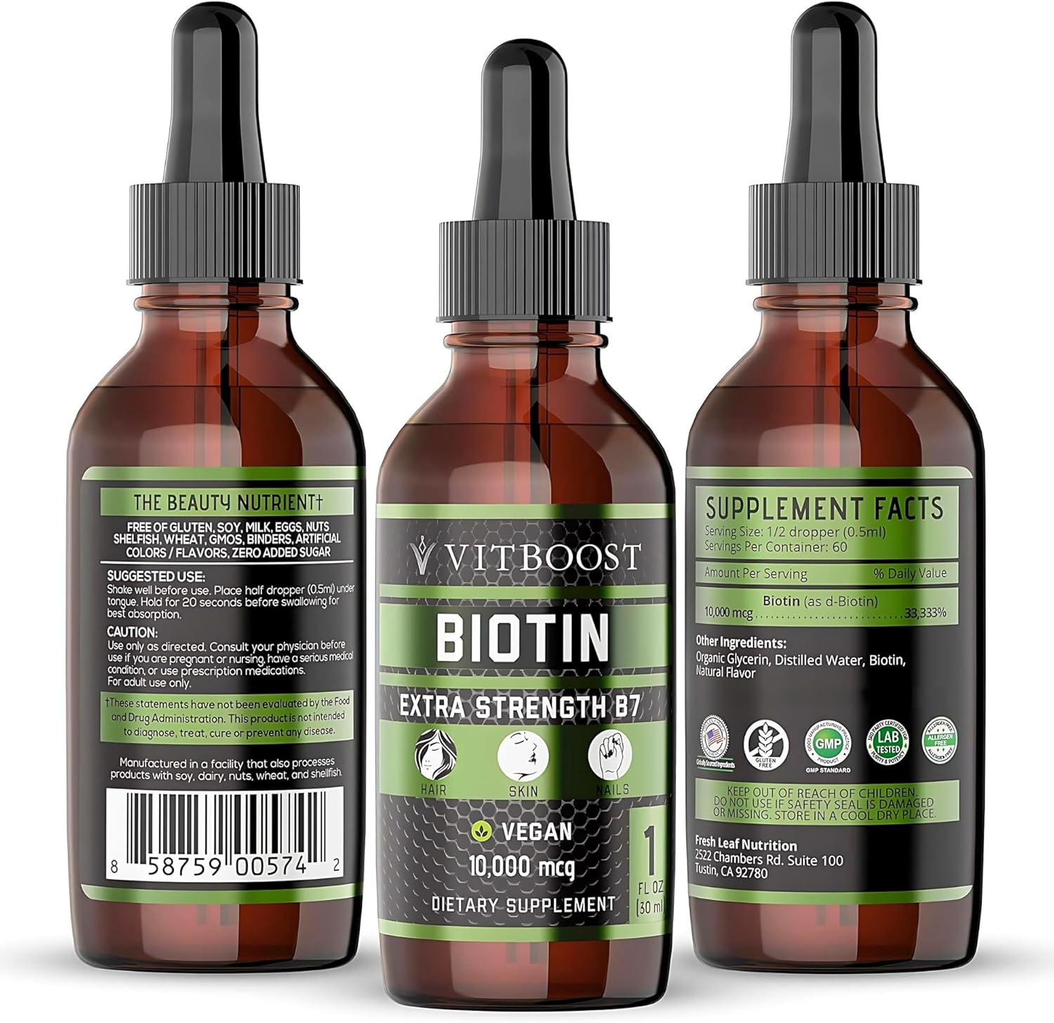 About this item PREMIUM QUALITY - Extra Strength 10,000mcg Biotin Liquid Drops with Organic Berry Flavor | 60 Servings | Vegan Formula Supports Hair Growth, may help hair appear fuller, Strong Nails, Healthy Skin | NO Artificial Preservatives | MADE IN USA. HAIR GROWTH, STRONG NAILS, & HEALTHY SKIN - Biotin is a water-soluble B-vitamin that your body needs to convert food and nutrients into energy. If you are losing hair, this may be in result of not getting enough Biotin. Our Biotin stimulates the natural production of collagen to help stimulate & nourish hair follicles for longer, stronger, thicker hair. EXTRA STRENGTH VEGAN SUPPLEMENT - 10,000 MCG of Vegan Biotin B7 | HIGHEST POTENCY available to maximize absorption. VitBoost provides pure nutritional ingredients to ensure better results in hair care, skin and nails. Vitboost hair skin and nails vitamins is enhanced premium formula and doubles the strength of biotin 5000mcg , it is 10,000mcg. LIQUID BENEFITS - Aside from being easier to consume, liquid drops can be easier and more gentle on the digestive system. With Vitboost liquid supplements there are no fillers or excess ingredients used! Combining high quality ingredients, while removing the excess, and making it easier to consume is what we like to refer to as the “Liquid Benefits.” Sublingual Liquid makes it highly absorbable and ultra-potent. NO ARTIFICIAL PRESERVATIVES - No artificial ingredients or preservatives - Non-GMO ingredients - Allergen & GLUTEN FREE - Free of Soy, Milk, Egg, Wheat, Peanuts, Shellfish, and Sugar – No fillers or binders | Made in USA, cGMP Lab Tested & Formulated by Professionals, Manufactured in a cGMP facility | NSF (NSF International has tested and certified dietary supplement product to meet specific safety and quality requirements) See more product details, PREMIUM QUALITY - Extra Strength 10,000mcg Biotin Liquid Drops with Organic Berry Flavor | 60 Servings | Vegan Formula Supports Hair Growth, may help hair appear fuller, Strong Nails, Healthy Skin | NO Artificial Preservatives | MADE IN USA, HAIR GROWTH, STRONG NAILS, & HEALTHY SKIN - Biotin is a water-soluble B-vitamin that your body needs to convert food and nutrients into energy. If you are losing hair, this may be in result of not getting enough Biotin. Our Biotin stimulates the natural production of collagen to help stimulate & nourish hair follicles for longer, stronger, thicker hair, EXTRA STRENGTH VEGAN SUPPLEMENT - 10,000 MCG of Vegan Biotin B7 | HIGHEST POTENCY available to maximize absorption. VitBoost provides pure nutritional ingredients to ensure better results in hair care, skin and nails. Vitboost hair skin and nails vitamins is enhanced premium formula and doubles the strength of biotin 5000mcg , it is 10,000mcg, LIQUID BENEFITS - Aside from being easier to consume, liquid drops can be easier and more gentle on the digestive system. With Vitboost liquid supplements there are no fillers or excess ingredients used! Combining high quality ingredients, while removing the excess, and making it easier to consume is what we like to refer to as the “Liquid Benefits.” Sublingual Liquid makes it highly absorbable and ultra-potent, NO ARTIFICIAL PRESERVATIVES - No artificial ingredients or preservatives - Non-GMO ingredients - Allergen & GLUTEN FREE - Free of Soy, Milk, Egg, Wheat, Peanuts, Shellfish, and Sugar – No fillers or binders | Made in USA, cGMP Lab Tested & Formulated by Professionals, Manufactured in a cGMP facility | NSF (NSF International has tested and certified dietary supplement product to meet specific safety and quality requirements)