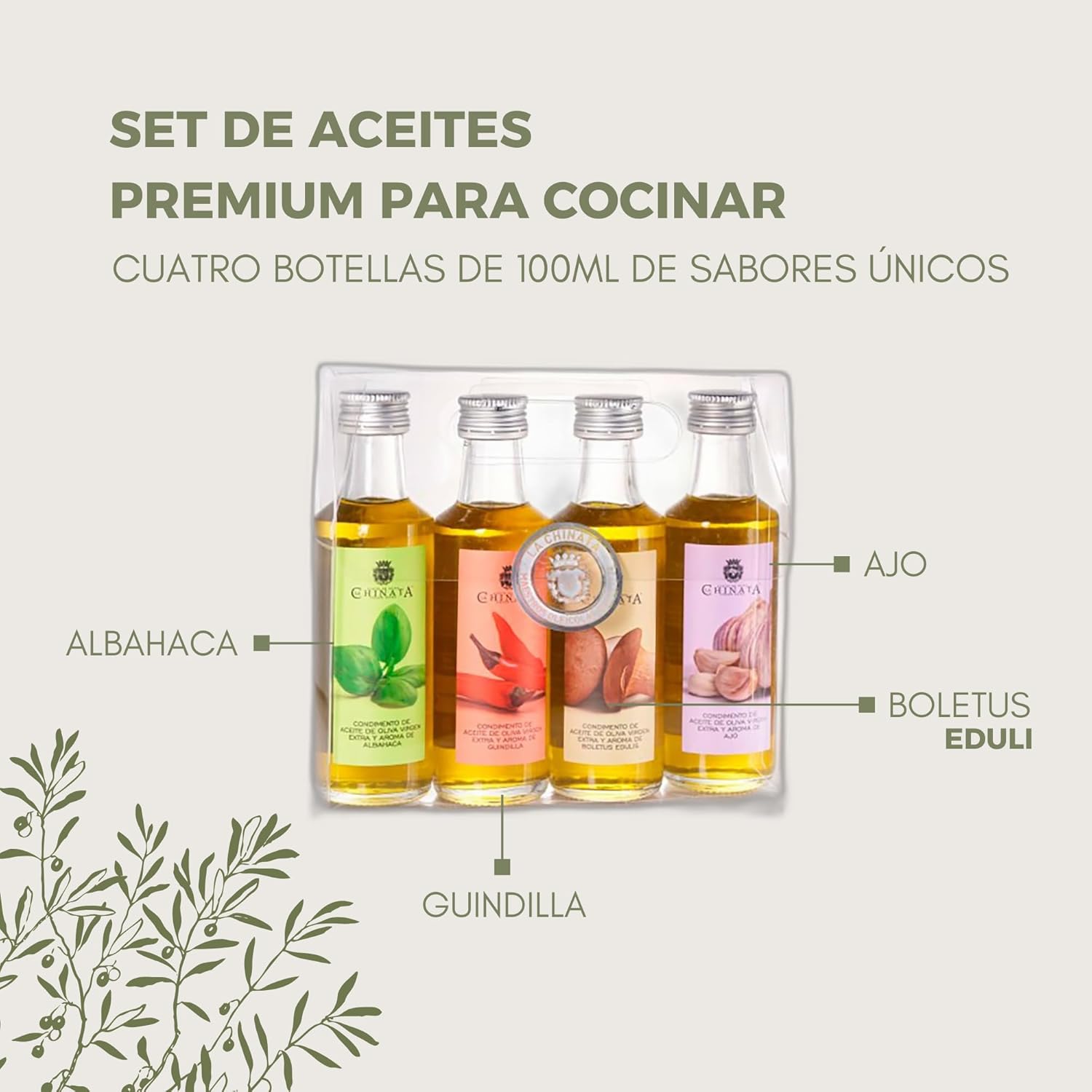 About The Product : Exclusive pack with four 100 ml bottles of flavoured EVOO by La Chinata:
