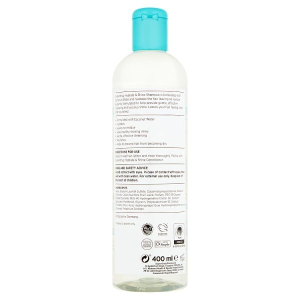 Product Information:Hydrate Your Hair With Superdrug Coconut Water Shampoo. The Cleansing Formula Nourishes Hair And Gives It A Luscious Shine While Also Preventing Dryness,Features:• Formulated With Coconut Water • Hydrates • Leaves No Residue • Gives Healthy-Looking Shine • Gentle, Effective Cleansing • Nourishes • Helps To Prevent Hair From Becoming Dry • Suitable For Vegetarians And Vegans,Warning Or Restrictions:Avoid Contact With Eyes. In Case Of Contact With Eyes, Rinse Well With Clean Water. For External Use Only,Product Specification:Aqua, Sodium Laureth Sulfate, Cocamidopropyl Betaine, Sodium Chloride, Cocos Nucifera Fruit Juice, Parfum, Peg-18 Glyceryl Oleate/Cocoate, Peg-40 Hydrogenated Castor Oil, Sodium Benzoate, Panthenol, Glycerin, Polyquaternium-10, Sodium Formate, Citric Acid, Hydroxypropyl Guar Hydroxypropyltrimonium Chloride, Potassium Sorbate,Product Uses:Apply To Wet Hair, Lather And Rinse Thoroughly,Recyclable:Bottle Cap On - Recycle,Tips And Advice:Use With Superdrug Hydrate &Amp; Shine Coconut Water Conditioner
