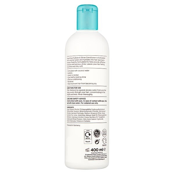 Product Information:Hydrate Your Hair With Superdrug Coconut Water Conditioner. The Moisturising Formula Nourishes Hair, Leaving It Silk-Soft And With A Luscious Shine,Features:• Formulated With Coconut Water • Hydrates • Leaves No Residue • Gives Healthy-Looking Shine • Effective Conditioning • Revitalises • Helps To Prevent Hair From Becoming Dry • Suitable For Vegetarians And Vegans,Warning Or Restrictions:Avoid Contact With Eyes. In Case Of Contact With Eyes, Rinse Well With Clean Water. For External Use Only,Product Specification:Aqua, Cetearyl Alcohol, Distearoylethyl Hydroxyethylmonium Methosulfate, Glycerin, Behentrimonium Chloride, Cetrimonium Chloride, Isopropyl Palmitate, Parfum, Dicaprylyl Ether, Cocos Nucifera Fruit Juice, Helianthus Annuus Seed Oil, Phenoxyethanol, Panthenol, Isopropyl Alcohol, Cocos Nucifera Oil, Tocopherol, Hydrolyzed Wheat Protein, Citric Acid, Sodium Hydroxide, Sodium Benzoate, Potassium Sorbate,Product Uses:After Shampooing Squeeze Excess Water From Your Hair. Apply Evenly Through Your Hair, Concentrating On The Lengths And Ends. Rinse Thoroughly,Recyclable:Bottle Cap On - Recycle,Tips And Advice:Use With Superdrug Hydrate &Amp; Shine Coconut Water Shampoo