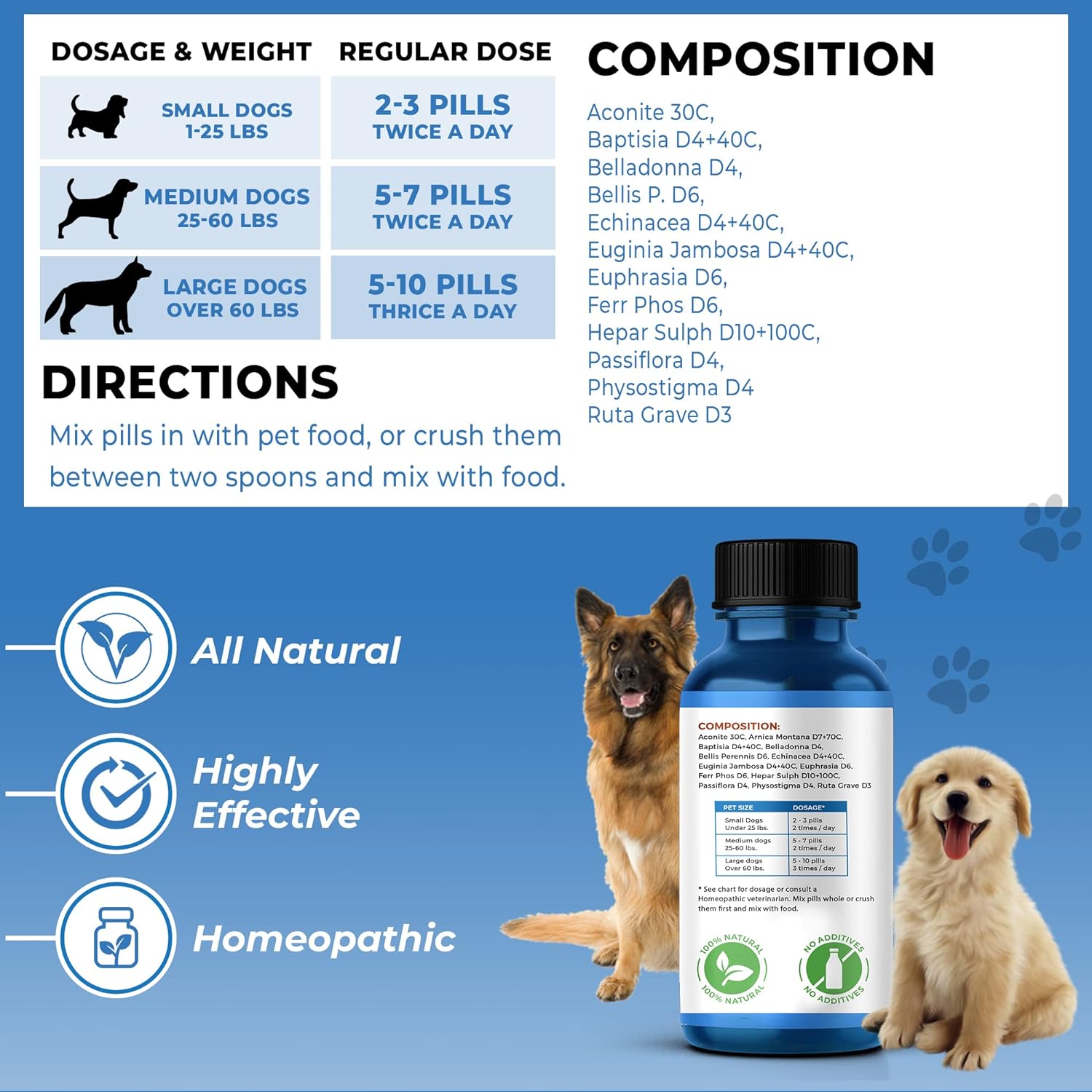 Easy On the Eyes - Recurring dog eye infections can significantly reduce your pet's quality of life. Support their sight with a gentle yet effective dog supplement known to help eye pain, pink eye (conjunctivitis), blurry vision, and droopy lidsFull Solution Care - dog eye wipes, ointment and eye drops for dogs ease symptoms of infection but not the cause. This natural dog eye infection treatment and vision support not only helps reduce dog eye discharge, doggy tears, and painful inflammation but also addresses the root cause of many canine eye problems; often resulting from allergies and respiratory infectionsPainless Pills - Stop the struggle of administering eye drops, an eye wash or a messy eye cleaner for dogs; your easy to use healthy vision supplement for dogs comes in tiny, scentless, and flavorless pills that are easy to take and leave no side-effects!Dog-Mom-Approved - Protect your pet's health with canine eye infection pills made from select plants like Aconite, Arnica, Echinacea, Hepar sullph, and more; this holistic plant based formula is made in a registered dietary supplement facility without artificial ingredients, glycerin - a sugar alcohol, or other preservatives
