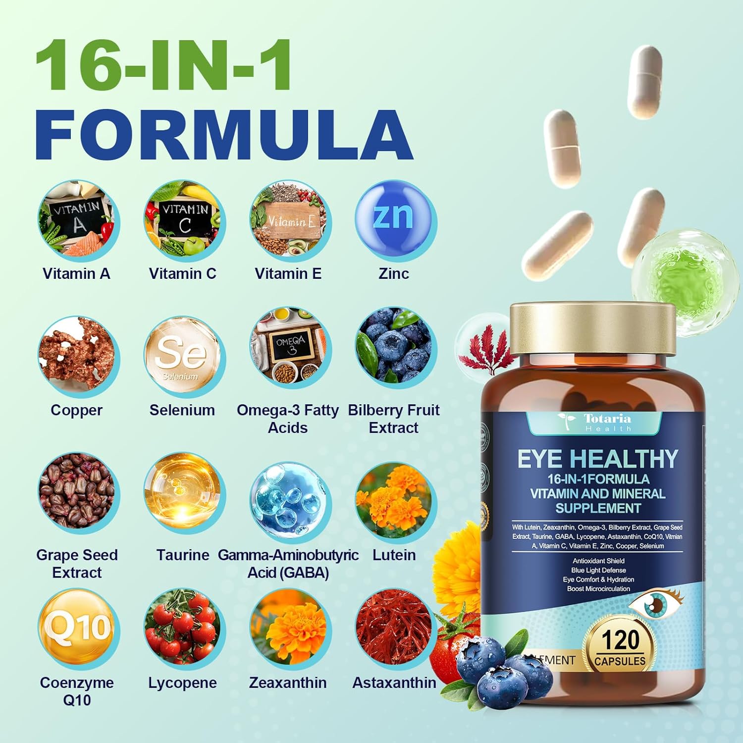 About this item Advanced Eye Support Formula Crafted with AREDS 2-inspired nutrients including lutein, zeaxanthin, and antioxidant vitamins A/C/E to help maintain healthy eyes and manage oxidative stressors from daily environmental factors. Digital Comfort Blend Features bilberry extract and grape seed extract with carotenoids that support eye comfort in blue light environments, while promoting natural moisture balance. Hydration Support Complex Combines omega-3s (DHA/EPA), taurine, and astaxanthin to help maintain tear film balance for occasional dryness management related to modern lifestyles. Nutrient Delivery System Enhanced with CoQ10 and GABA to support healthy nutrient delivery to eye structures for sustained visual focus. Antioxidant Synergy Matrix Delivers 16 essential nutrients including zinc, selenium, and lycopene in precise ratios to support the eyes' antioxidant response to environmental factors. Premium Quality from Totaria Totaria is committed to providing the highest quality products. Our formula is gluten-free, soy-free, and contains no common allergens. It is third-party lab tested and GMP certified to ensure purity and potency See more product details,Advanced Eye Support Formula Crafted with AREDS 2-inspired nutrients including lutein, zeaxanthin, and antioxidant vitamins A/C/E to help maintain healthy eyes and manage oxidative stressors from daily environmental factors,Digital Comfort Blend Features bilberry extract and grape seed extract with carotenoids that support eye comfort in blue light environments, while promoting natural moisture balance,Hydration Support Complex Combines omega-3s (DHA/EPA), taurine, and astaxanthin to help maintain tear film balance for occasional dryness management related to modern lifestyles,Nutrient Delivery System Enhanced with CoQ10 and GABA to support healthy nutrient delivery to eye structures for sustained visual focus,Antioxidant Synergy Matrix Delivers 16 essential nutrients including zinc, selenium, and lycopene in precise ratios to support the eyes' antioxidant response to environmental factors,Premium Quality from Totaria Totaria is committed to providing the highest quality products. Our formula is gluten-free, soy-free, and contains no common allergens. It is third-party lab tested and GMP certified to ensure purity and potency