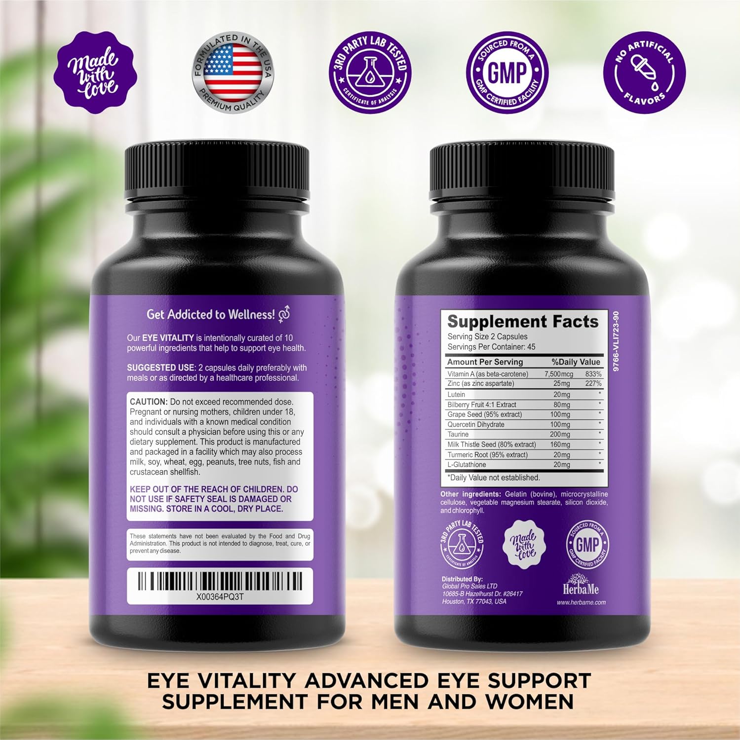 About this item Lutein-Based Vision Supplements – Fortified with Lutein, Vitamin A as Beta Carotene, Grape Seed, Milk Thistle, L-Glutathione, Turmeric, Antioxidants, and other eye-essential vitamins and minerals our dry eye supplement nourishes and protects the eyes while support restoring macular pigment and supporting healthy vision. Diminish Eye Strain and Fatigue – These eye health supplements for adults also support improving contrast sensitivity and reducing glare caused by computer, TV, smartphone, and tablet blue light which can impact visual performance and clarity. Proactive Age Protection – Especially important for aging men and women our vision supplements help you get out ahead of potential eye health problems that happen with age. Important for maintaining pressure, focus, and good eyesight. Long-Term Eye Care and Support – Our eye vitamins are a smart choice to support macular and visual health due to aging and light sensitivities, so you can keep seeing clearly in your senior years. We’ve made easy-swallow capsules to add to your daily vitamin and multivitamin regimen with our eye health supplement that’s packed with healthy minerals, and herbs that specifically support your eyes and visual performance. Trusted Purity and Testing – Crafted in a GMP-certified facility, formulated in the USA, and third-party tested our eye supplement is safe, effective, and is free of artificial flavors for premium support. It’s also backed by a 100% satisfaction guarantee. See more product details,Lutein-Based Vision Supplements – Fortified with Lutein, Vitamin A as Beta Carotene, Grape Seed, Milk Thistle, L-Glutathione, Turmeric, Antioxidants, and other eye-essential vitamins and minerals our dry eye supplement nourishes and protects the eyes while support restoring macular pigment and supporting healthy vision,Diminish Eye Strain and Fatigue – These eye health supplements for adults also support improving contrast sensitivity and reducing glare caused by computer, TV, smartphone, and tablet blue light which can impact visual performance and clarity,Proactive Age Protection – Especially important for aging men and women our vision supplements help you get out ahead of potential eye health problems that happen with age. Important for maintaining pressure, focus, and good eyesight,Long-Term Eye Care and Support – Our eye vitamins are a smart choice to support macular and visual health due to aging and light sensitivities, so you can keep seeing clearly in your senior years. We’ve made easy-swallow capsules to add to your daily vitamin and multivitamin regimen with our eye health supplement that’s packed with healthy minerals, and herbs that specifically support your eyes and visual performance,Trusted Purity and Testing – Crafted in a GMP-certified facility, formulated in the USA, and third-party tested our eye supplement is safe, effective, and is free of artificial flavors for premium support. It’s also backed by a 100% satisfaction guarantee