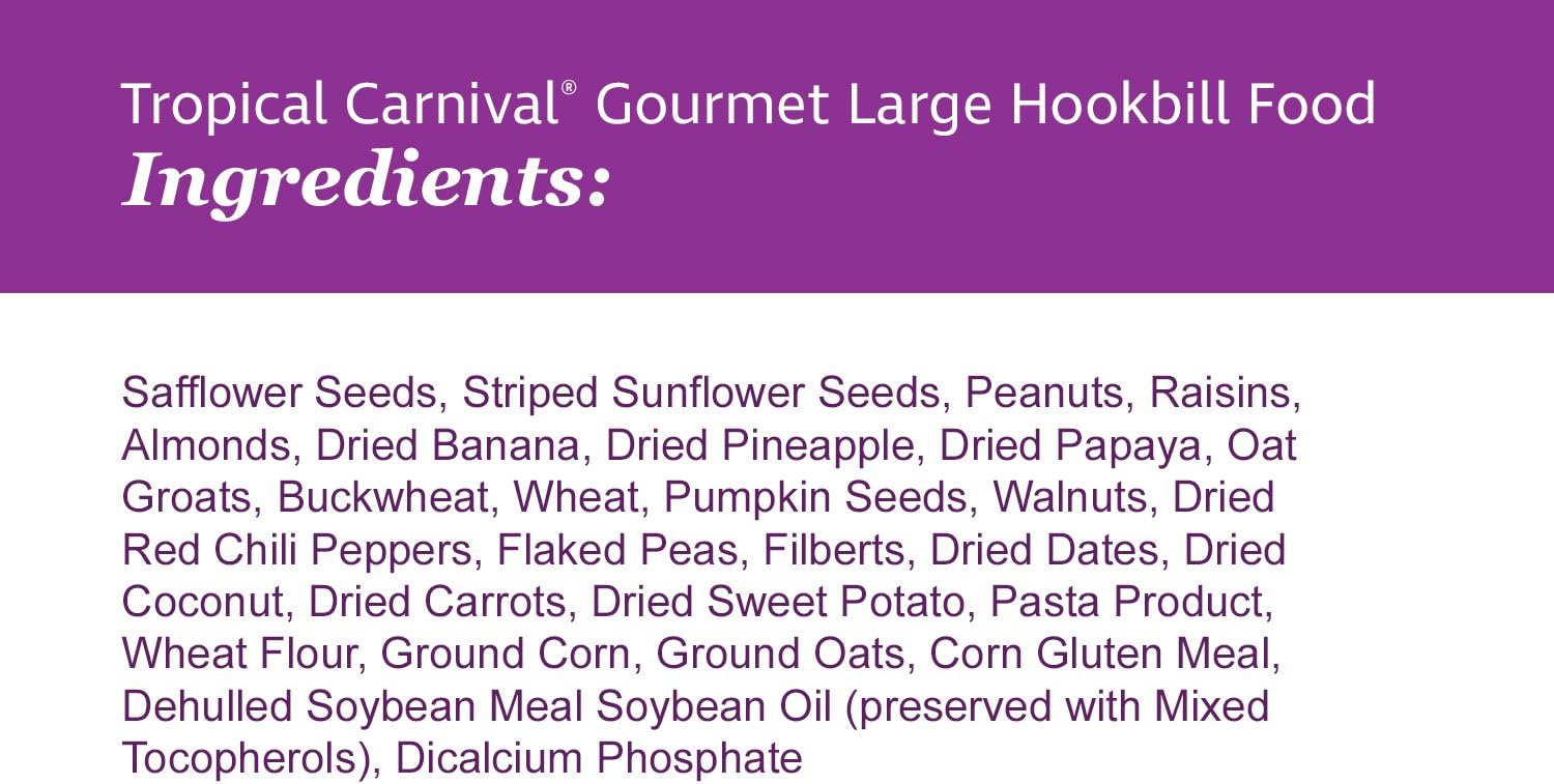 Brown’S Tropical Carnival Gourmet Large Hookbill Food For Parrots, Cockatoos And Macaws Over 13" Is A Natural, Vitamin-Nutrient-Fortified Daily Diet. It'S A Food And Treat, All-In-One. Our Super Premium Gourmet Food Is Specifically Formulated To Help Large Hookbills Thrive. We'Ve Jam-Packed It With A Mix Of Fruits, Nuts, Vegetables And Wholesome Seeds And Grains. Tropical Carnival Includes Natural Preservatives To Ensure Freshness. Omega Fatty Acids, Antioxidants And Beneficial Bacteria Help Support Good Digestion. Your Large Hookbills Will Find Tropical Carnival Simply Irresistible