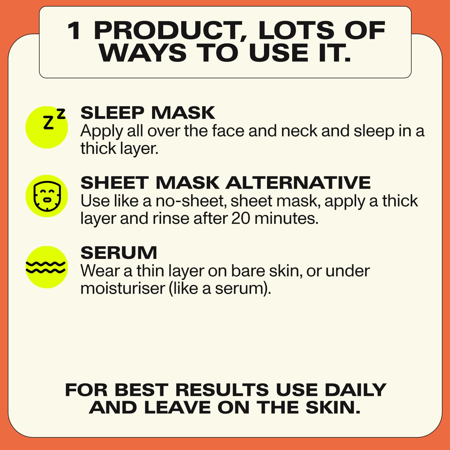 WHEN TO USE IT As often as needed (daily or weekly); in a thin layer as a face primer or as a lightweight leave-on face mask skincare; in a thick layer as a heavier clean and clear mask for 20 minutes and rinse, or for best results leave as an overnight face mask beauty. Can be used under makeup