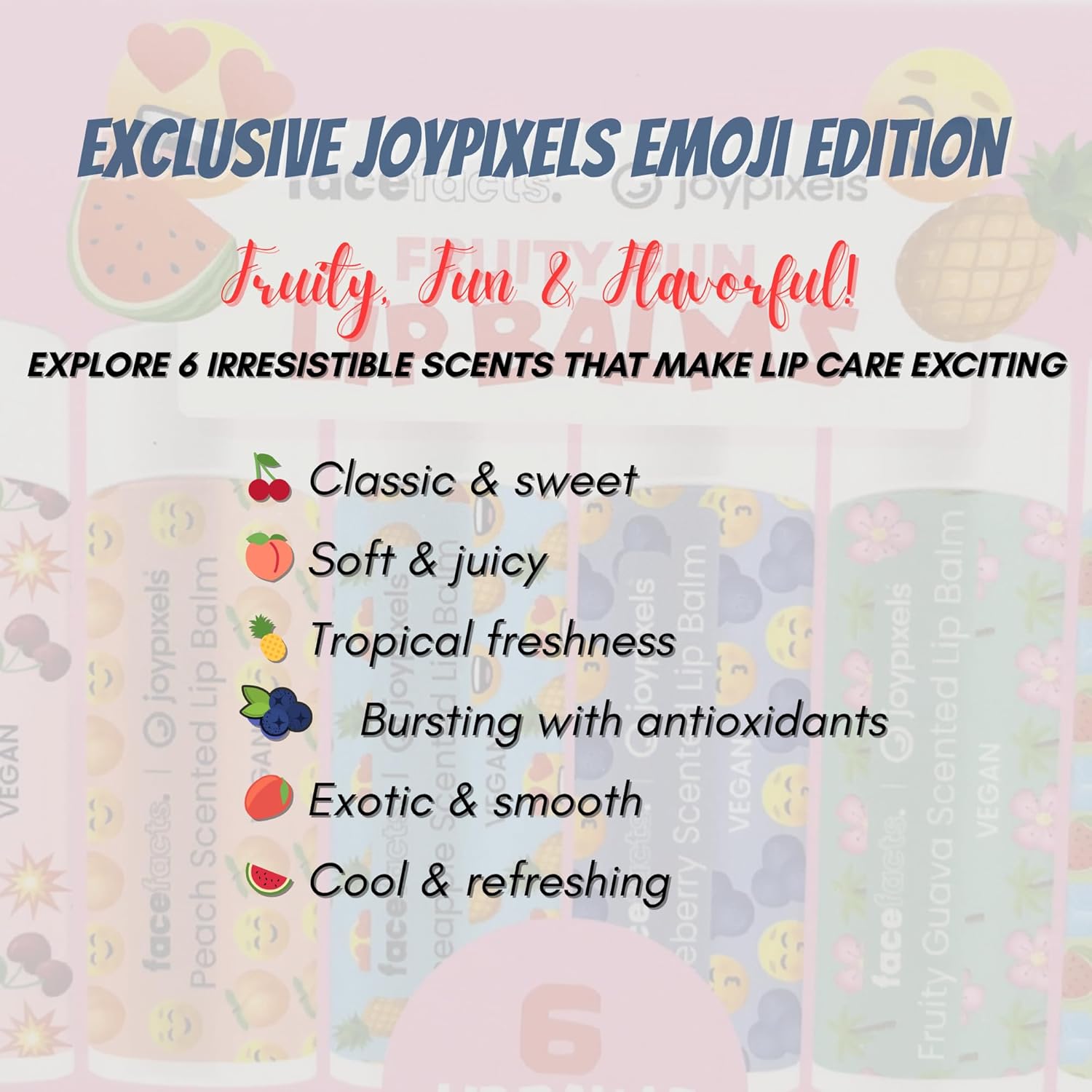 Face Facts X Joypixels Fruity Fun Lip Balm Set – 6-Pack Vegan Lip Balms In Cherry, Peach, Pineapple, Blueberry, Guava & Watermelon – Emoji Gift Set For Teens & Girls – Hydrating Lip Care